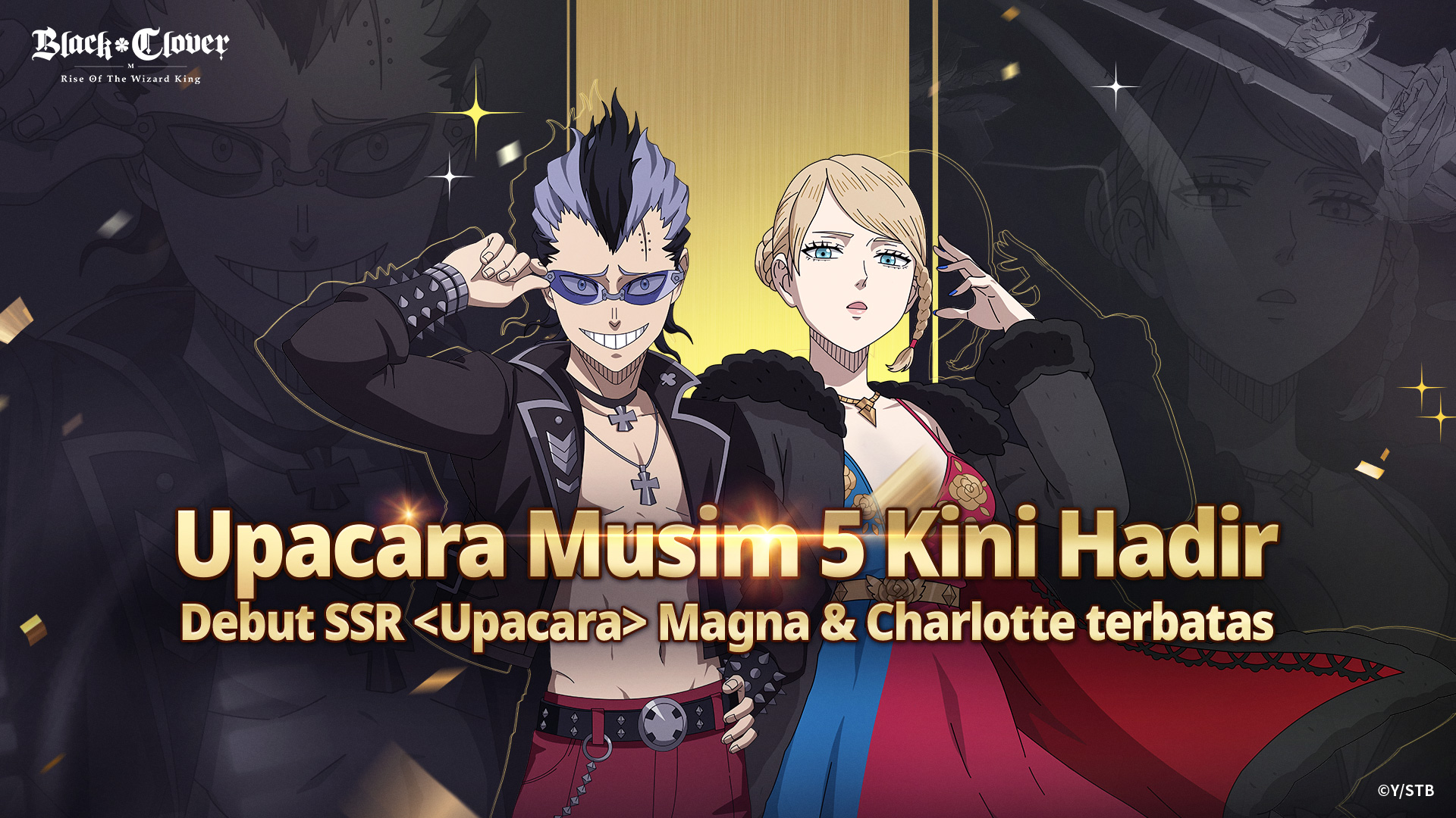 Season 5 game RPG Black Clover: Rise Of The Wizard King yang baru dirilis akan memperkenalkan dua karakter SSR terbaru, yaitu SSR <Upacara> Charlotte dan Magna. Pemain bisa mendapatkan kedua karakter tersebut melalui Event Berbatas Waktu atau Gerbang Pertemuan. Selain kehadiran dua karakter SSR terbaru, update Season 5 Black Clover M: Rise Of The Wizard King juga akan menghadirkan Event spesial berbatas waktu, yaitu Batelgigas Raid.