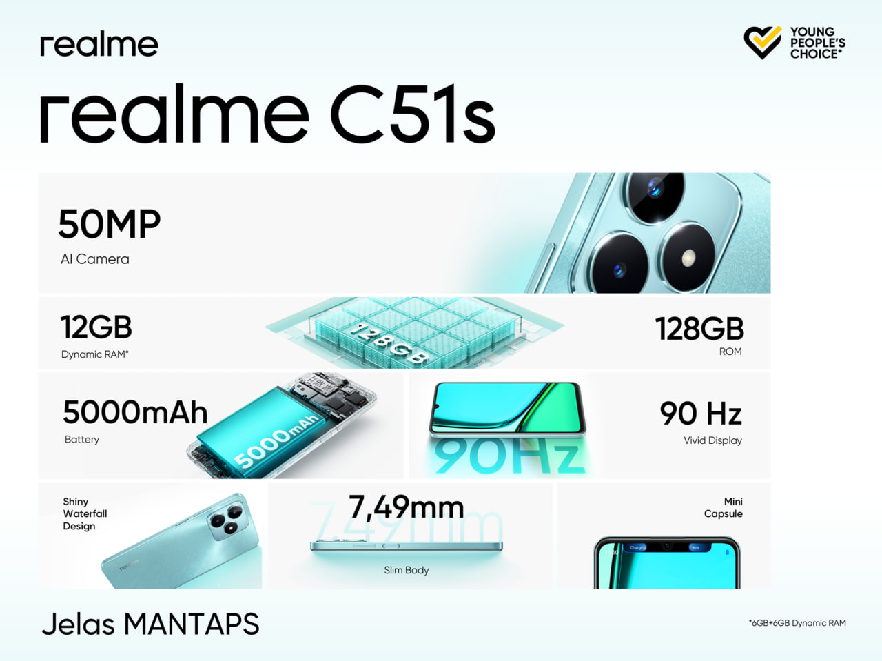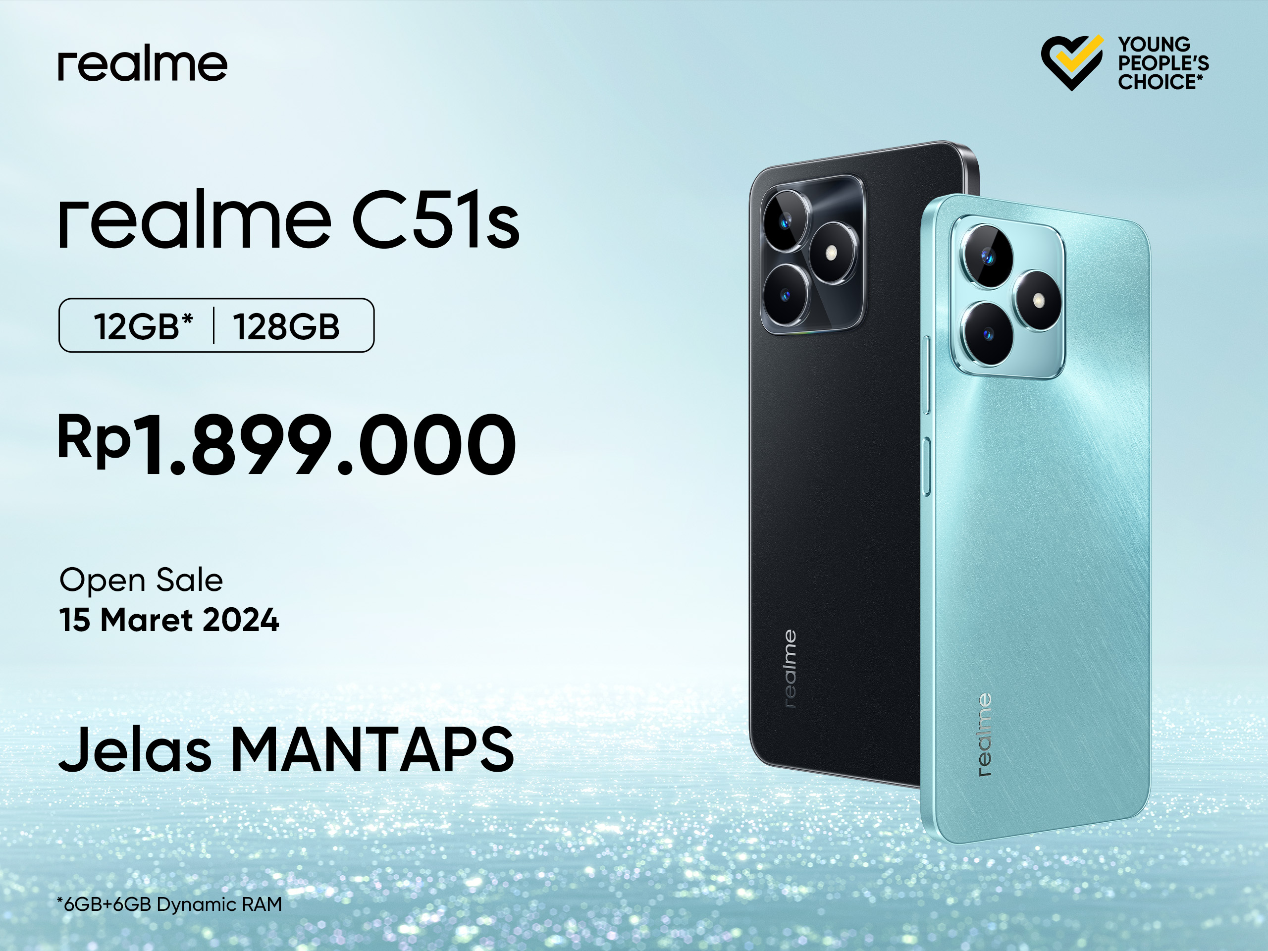 realme sebagai brand Pilihannya Anak Muda, mempertahankan posisinya sebagai penyedia produk smartphone berkualitas dengan spesifikasi dan fitur terbaik di semua lapisan dengan meluncurkan realme C51s di Indonesia. Smartphone Champion Jelas Mantap ini membawa gabungan keunggulan di kelas entry-level sehingga andal untuk segala aktivitas. C51s membawa spesifikasi seperti bodi Ultra Slim 7,49mm, kamera AI 50MP, 90Hz Vivid Display, memori hingga 12GB*|128GB, juga kehadiran Mini Capsule dalam balutan Shiny Waterfall Design.