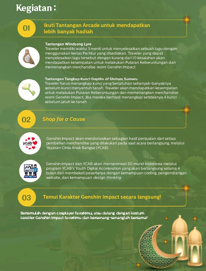 Selain merchandise Genshin Impact yang akan dijual selama event berlangsung, para penggemar maupun player Genshin Impact juga dapat menikmati berbagai aktivitas dan tantangan untuk memenangkan merchandise dari Genshin Impact, serta bertemu dengan para cosplayer.