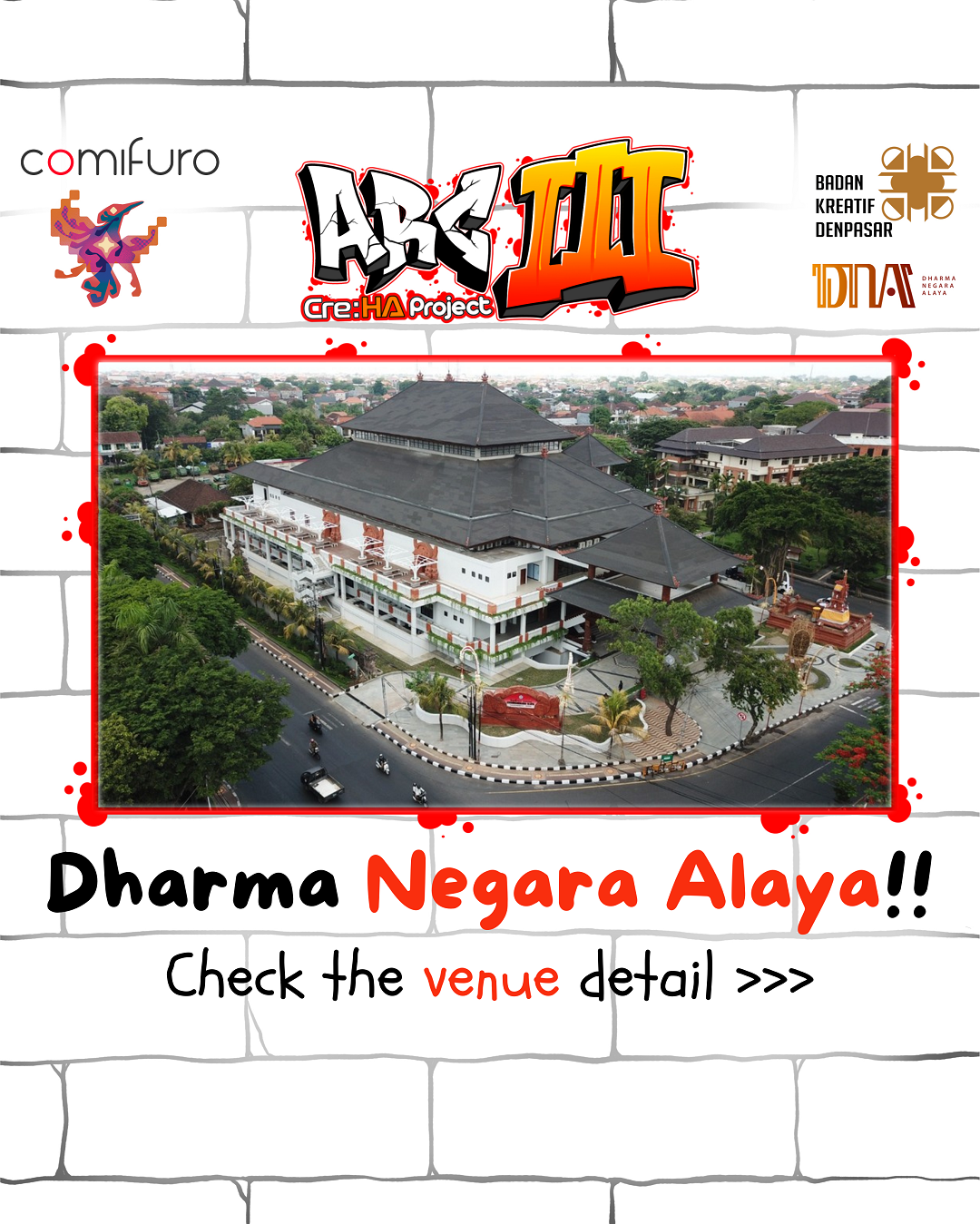 Cre:Ha Project, didukung oleh Comic Frontier serta Pemerintah Denpasar melalui Badan Kreatif Denpasar, dan Youth Fest, dengan bangga mengumumkan penyelenggaraan event Area Creator III (ARC III) di Bali pada 9 Juni 2024 mendatang di gedung Dharma Negara Alaya!