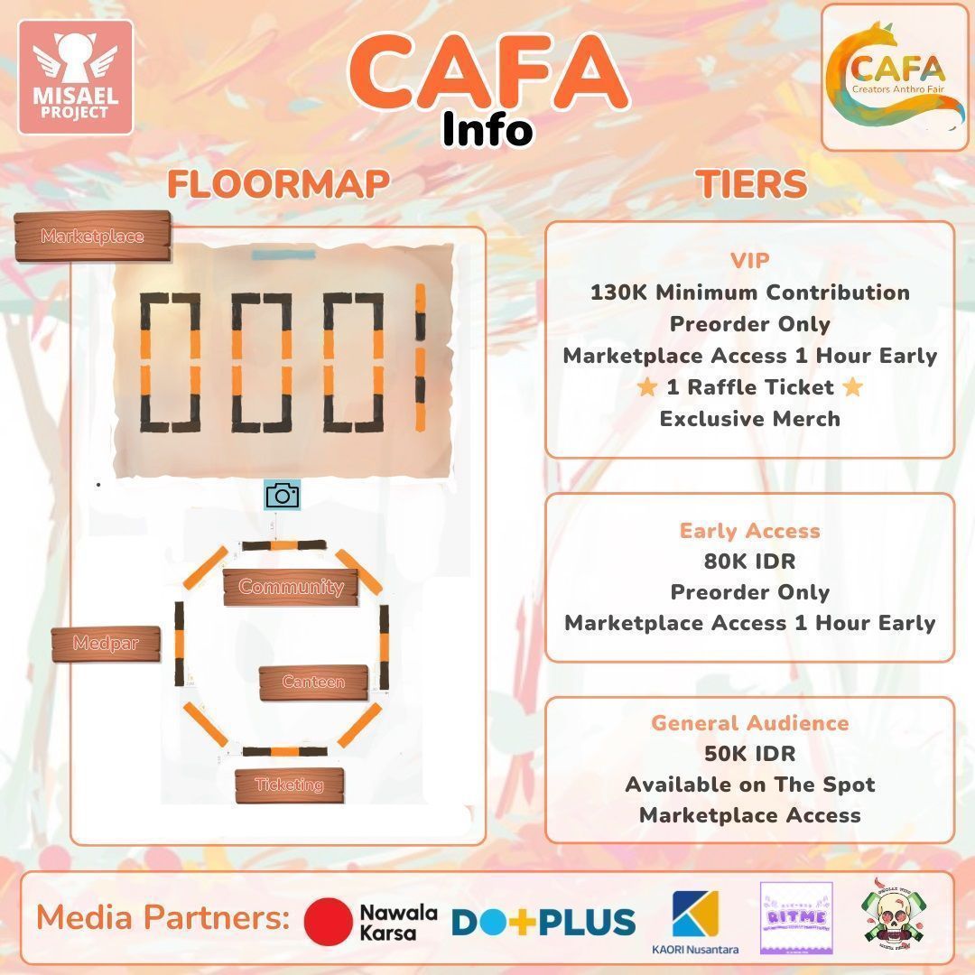 CAFA (Creators Anthro Fair) adalah sebuah art market event dengan tema khusus furry/antropomorfik pertama di Indonesia dari Misael Project! Event ini rencananya bakal hadir pada Kamis, 23 Mei 2024 mendatang yang bertepatan dengan hari libur Waisak.