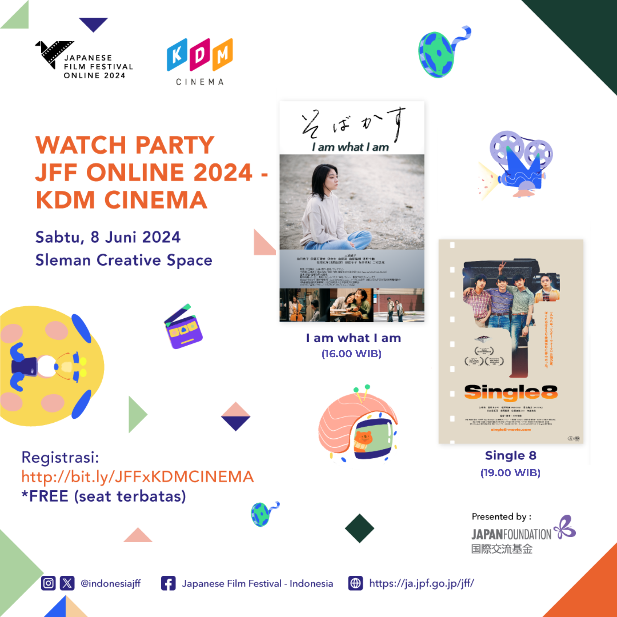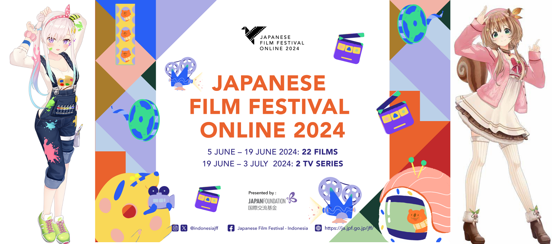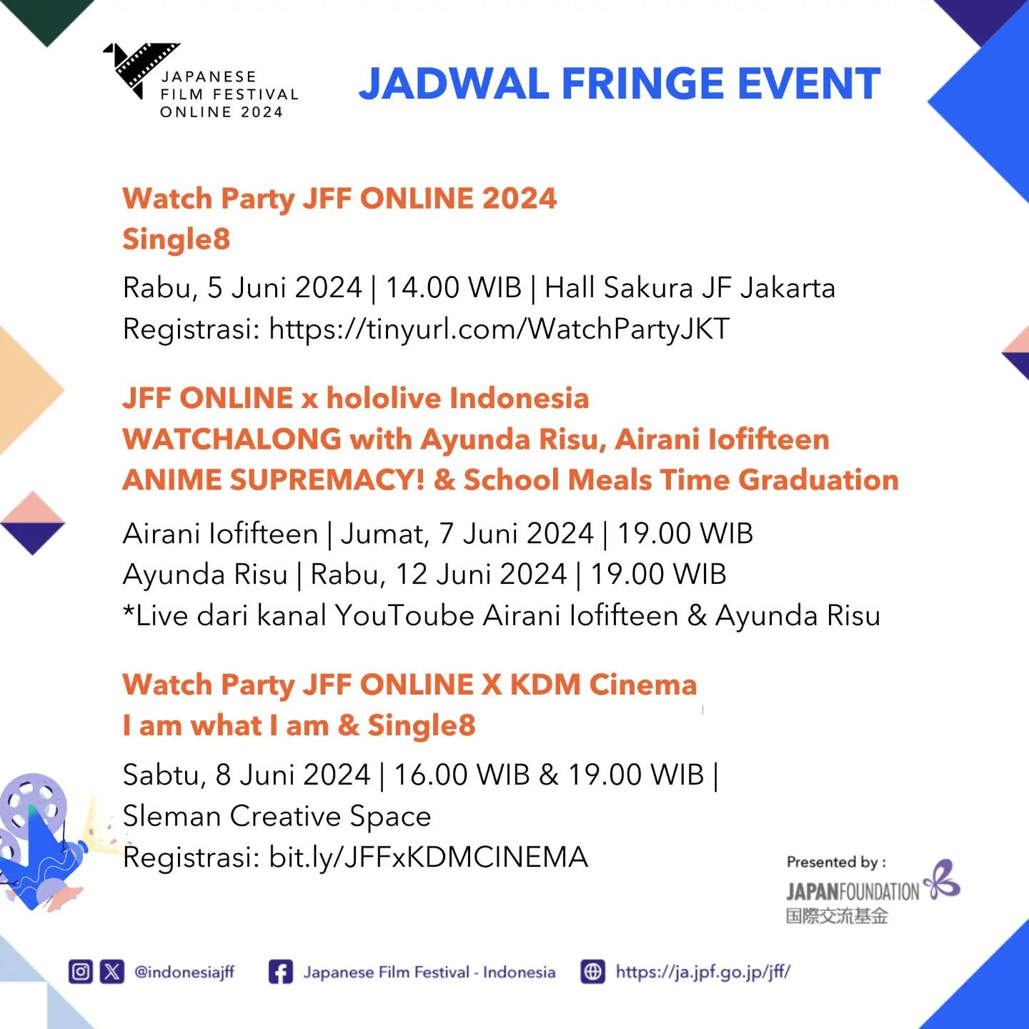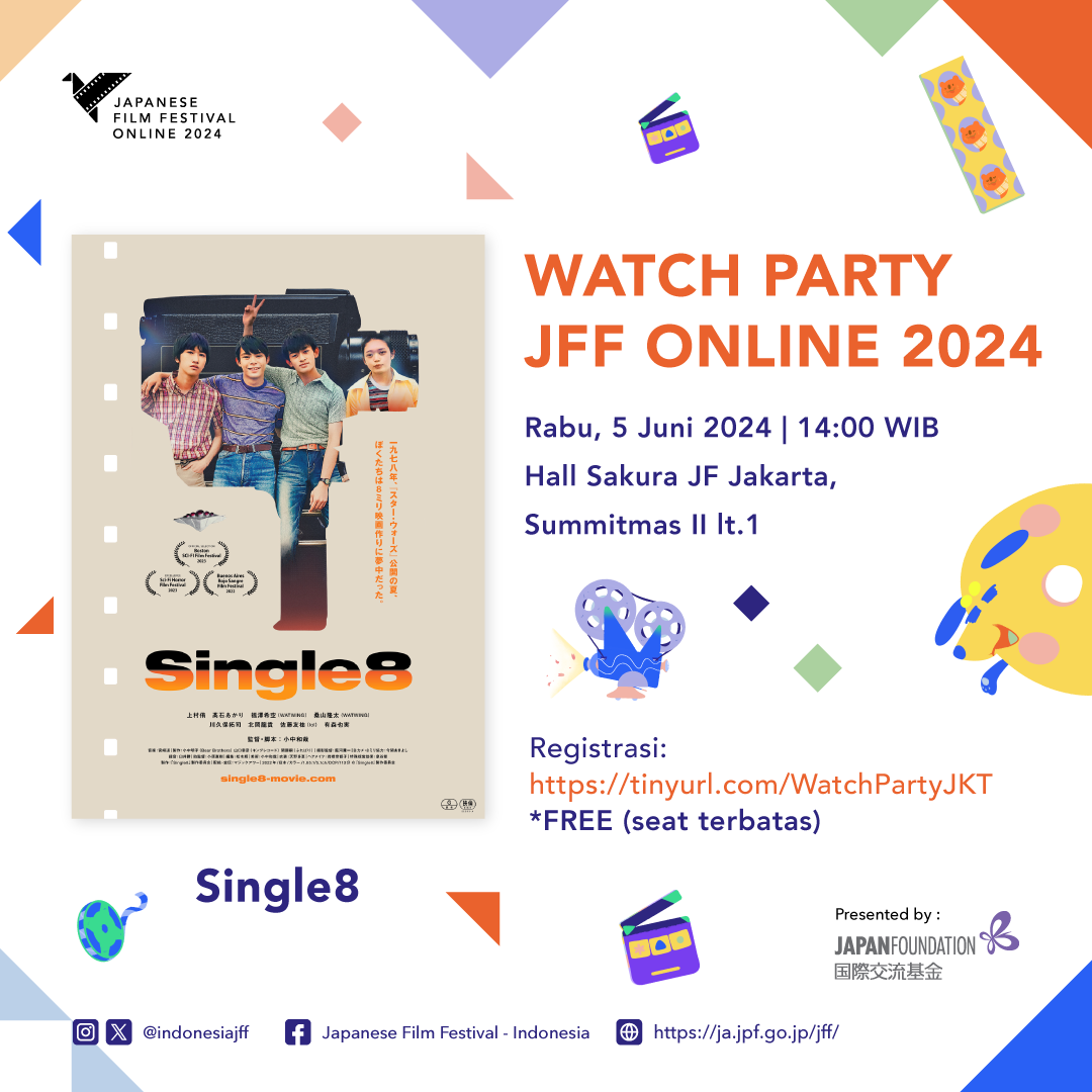 Tak hanya mengajikan deretan film dan dorama Jepang pilihan, event JFF Online 2024 juga akan menghadirkan serangkaian acara menarik yang bakal diadakan secara online dan offline (luring). Di bagian acara nonton bareng alias “nobar” online, event ini bakal diramaikan oleh dua vtuber Hololive ID, Airani Iofifteen dan Ayunda Risu! Nobar JFF Online 2024 bersama Iofi bakal diadakan pada 7 Juni 2024 jam 19.00 WIB untuk film “ANIME SUPREMACY!”, sedangkan Nobar bersama Risu bakal digelar pada 12 Juni 2024 jam 19.00 WIB untuk film “School Meals Time Graduation“. Acara nobarnya sendiri akan diadakan langsung dari channel YouTube masing-masing vtuber.