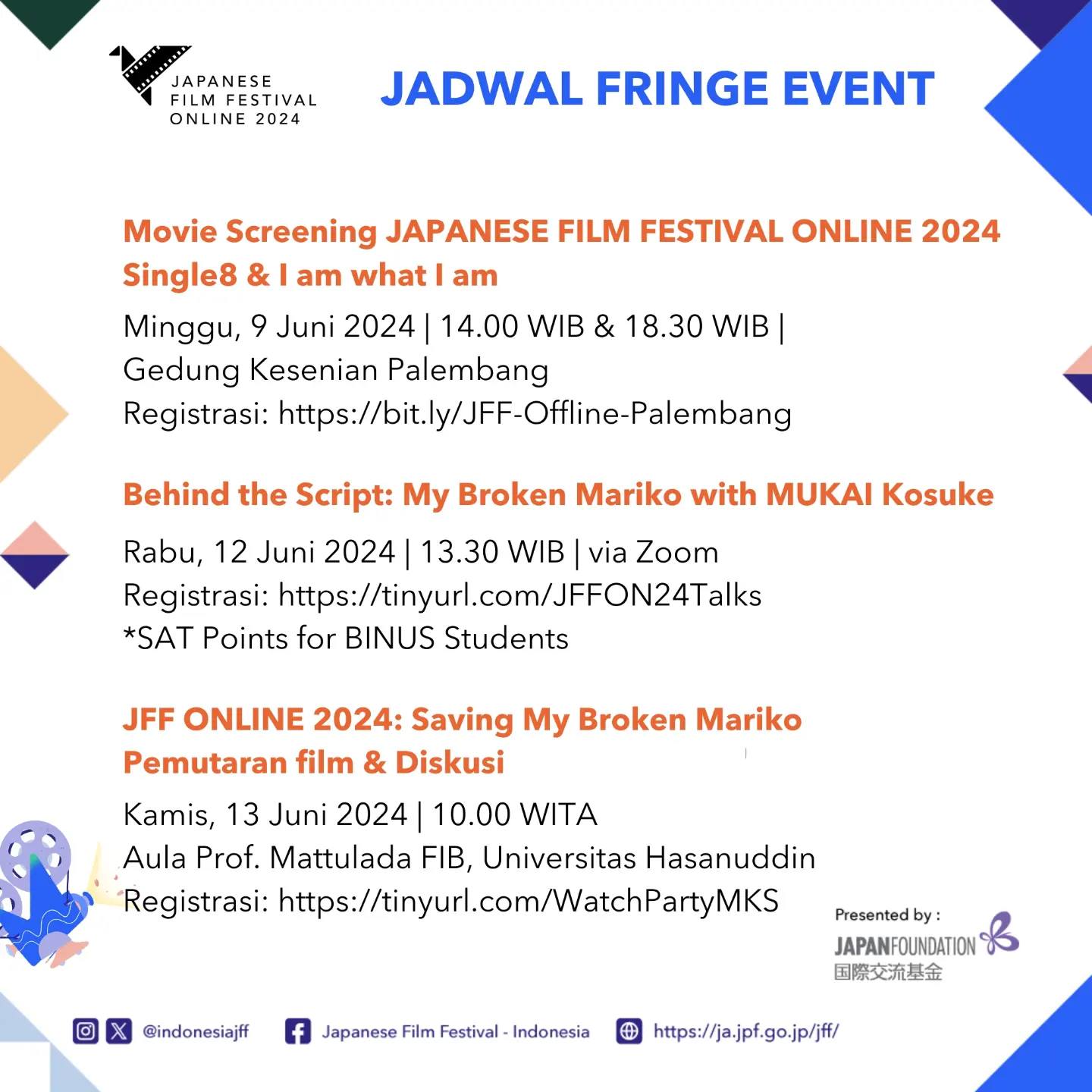 Event JFF Online 2024 juga bakal mendatangkan salah satu kru film yang ditayangkan di acaranya, yaitu Kousuke Mukai yang menulis skenario film My Broken Mariko! Kousuke Munai sendri juga dikenal sebagai penulis skenario film seperti Linda, Linda, Linda (2005), A MAN (2022), dan beberapa episode dari serial drama Midnight Diner. Bekerjasama dengan Universitas Bina Nusantara (Binus), sesi acara yang bertajuk “Behind the Script: My Broken Mariko with MUKAI Kosuke” ini akan diadakan pada 12 Juni 2024 secara daring.