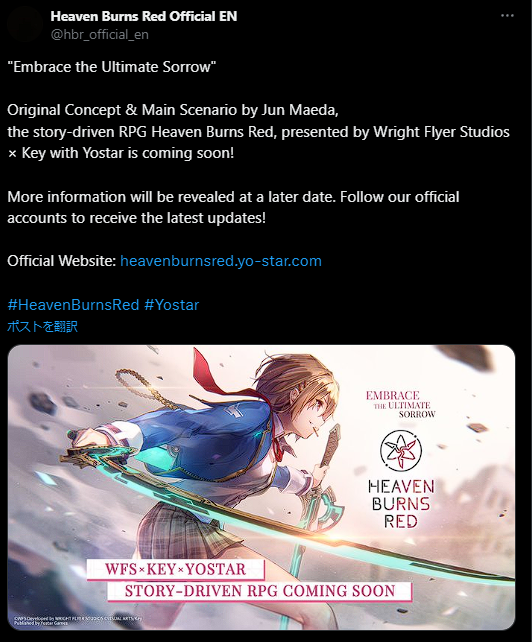 Apakah kalian ingat dengan Jun Maeda? Beliau adalah salah satu pendiri Key bersama Shinji Orito dan Itaru Hinoue yang juga terkenal dengan karyanya seperti AIR, Kanon, dan CLANNAD. Setelah 15 tahun vakum menulis skenario gim, pada 10 Februari 2022 yang lalu, Key bekerja sama bersama Wright Flyer Studio (WFS) merilis gim smartphone dengan judul Heaven Burns Red, dengan cerita serta lagu yang digarap oleh Jun Maeda sendiri. Setelah 2 tahun dirilis, akhirnya ada pengumuman penting dari gim ini!