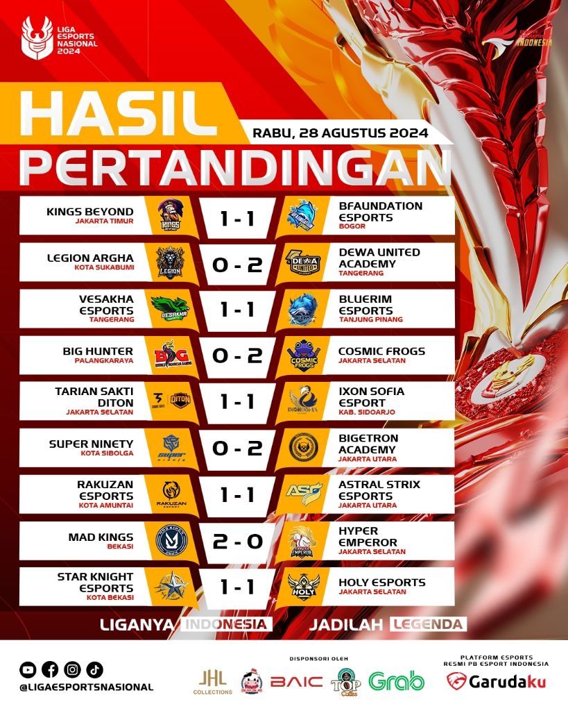 Liga 2 Esports Nasional masih akan berlanjut sampai ditemukan 2 tim teratas yang berhak untuk melangkah maju ke Liga 1 Esports Nasional yang akan digelar secara offline di Mall Taman Anggrek Jakarta Barat tanggal 5-27 Oktober 2024.