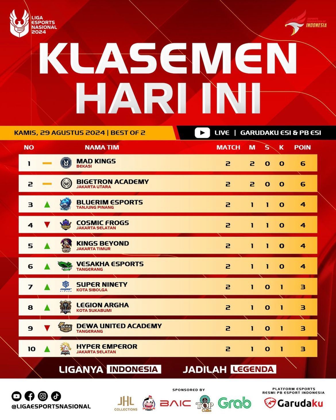 Di klasemen sementara, Mad Kings dari Bekasi masih tetap kokoh di puncak klasemen dengan poin penuh dan dua kemenangan di dua kali pertandingan, diikuti oleh Bigetron Academy yang juga mengumpulkan total 6 poin setelah dua hari pertandingan dengan hasil yang sama dengan Mad Kings. Sementara Big Hunter dengan hasil dua kali kekalahan menjadi juru kunci di Liga 2 Esports Nasional 2024 dengan tidak adanya point yang diraih.