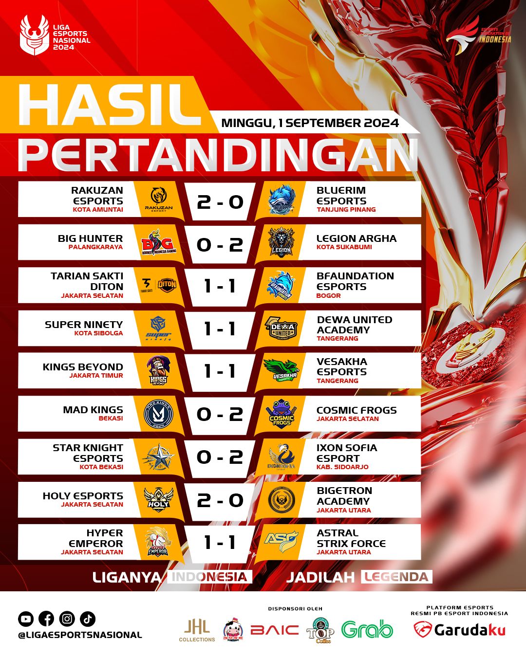 Hari kelima ini menjadi titik penting dalam perjalanan kompetisi, dengan Rakuzan Esports dari Kota Amuntai membuka kemenangan mereka atas Bluerim Esports dari Tanjung Pinang dengan skor 2-0. Kemudian, Legion Argha dari Sukabumi berhasil menumbangkan Big Hunter dari Palangkaraya, juga dengan skor 2-0, mengukuhkan dominasi mereka di lapangan. Beberapa pertandingan lain, seperti antara Bfaundation Esports dan Tarian Sakti Diton, serta Dewa United Academy melawan Super Ninety, berakhir imbang 1-1, menambah ketatnya persaingan di tengah klasemen. Kings Beyond dari Jakarta Timur juga harus puas berbagi poin dengan Vesakha Esports dari Tangerang setelah pertandingan mereka berakhir imbang 1-1.