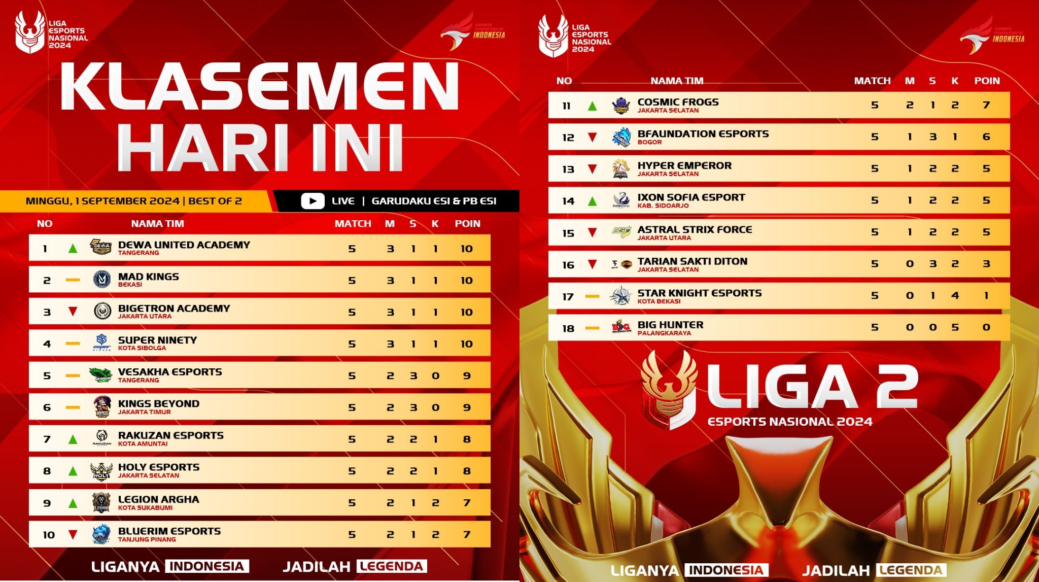 Dengan hasil-hasil ini, klasemen sementara mengalami pergeseran penting. Dewa United Academy dari Tangerang berhasil mengambil alih puncak klasemen dari Bigetron Academy, meskipun empat tim teratas yaitu Dewa United Academy, Bigetron Academy, Super Ninety, dan Mad Kings memiliki poin yang sama, yaitu 10 poin. Posisi mereka hanya dibedakan oleh selisih poin K/D/A, menunjukkan betapa ketat dan seimbangnya persaingan di Liga 2 Esports Nasional 2024.
