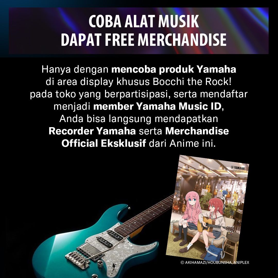 Pengunjung juga bisa mendapatkan merchandise set Bocchi the Rock! lengkap berupa 2 clear holder, 1 set pick gitar, serta buku beginners’s guide dengan melakukan pembelian alat musik Yamaha (gitar, bass, gitar amplifier Yamaha dan Line6, Ampeg, drum DTX, dan synthesizer) di dealer yang didatangi dengan nominal pembelian di atas Rp 3.000.000, Semuanya bisa didapatkan melalui dealer Yamaha Musik yang sudah ditentukan. Buruan datang, persediaan terbatas!