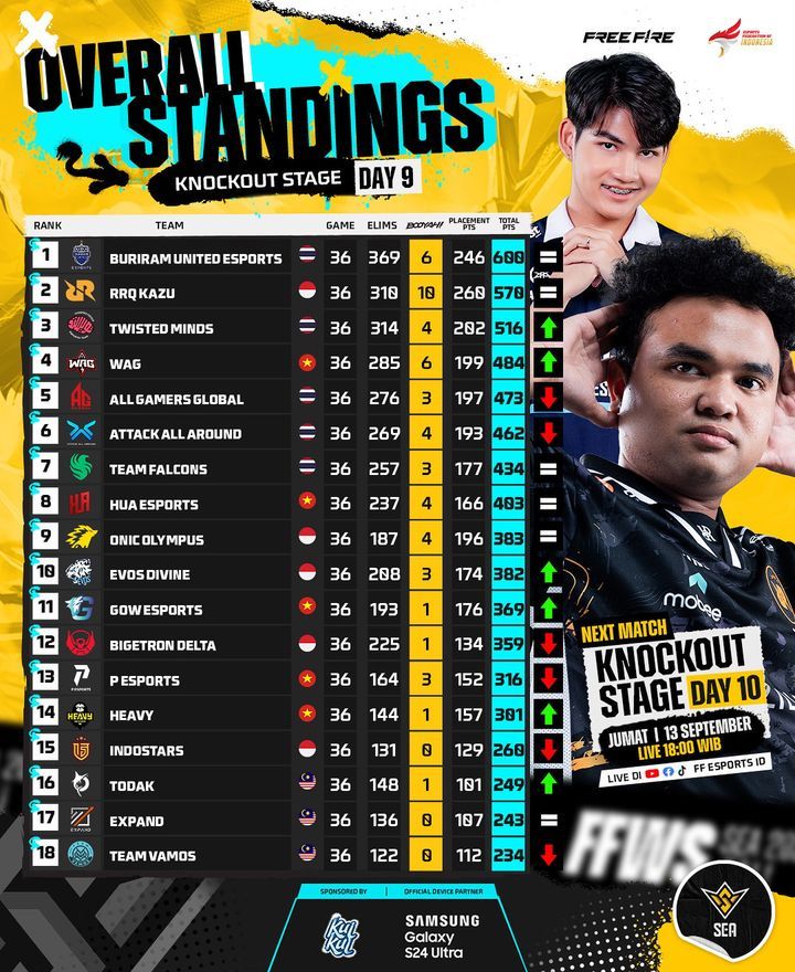 Turnamen Free Fire World Series (FFWS) SEA 2024 Fall bakal memasuki week ke-4 dan menyisakan 3 minggu pertandingan yang tersisa. Posisi puncak di klasemen sementara masih diraih oleh Buriram United Esports. Wakil Indonesia, RRQ Kazu yang sebelumnya gacor di puncak klasemen week 2 kini harus turun ke posisi #2, kurang 30 point untuk mengejar Buriram.
