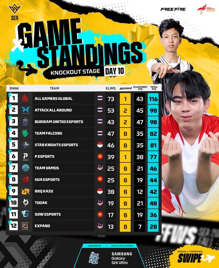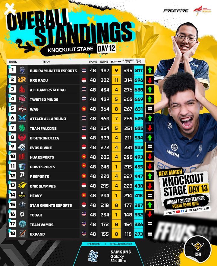 Buriram United Esports lagi-lagi menjadi raja di pekan ke-4 fase knock-out FFWS SEA 2024 Fall dengan mengumpulkan 817 poin di posisi puncak. RRQ Kazu kembali harus mengejar di posisi kedua dengan 690 poin, disusul oleh AG Global yang berselisih tipis di posisi 3 dengan 680 poin. Di posisi 4 dan 5 ada Twisted Minds dan WAG dengan 669 dan 631 poin.