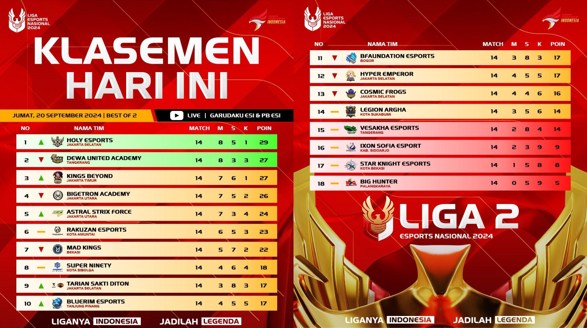 Liga 2 Esports Nasional 2024 telah memasuki minggu terakhir, dengan persaingan semakin ketat di papan klasemen. Pertandingan hari pertama minggu keempat memberikan beberapa kejutan dan memastikan bahwa perebutan dua slot promosi ke Liga 1 Esports Nasional akan berlangsung sengit hingga akhir. Holy Esports dari Jakarta Selatan berhasil mempertahankan posisi puncak klasemen dengan total 29 poin. Sementara itu Dewa United Academy dari Tangerang dan Kings Beyond dari Jakarta Timur sama-sama mengoleksi 27 poin di peringkat kedua dan ketiga, hanya terpaut tipis dari pemuncak klasemen.