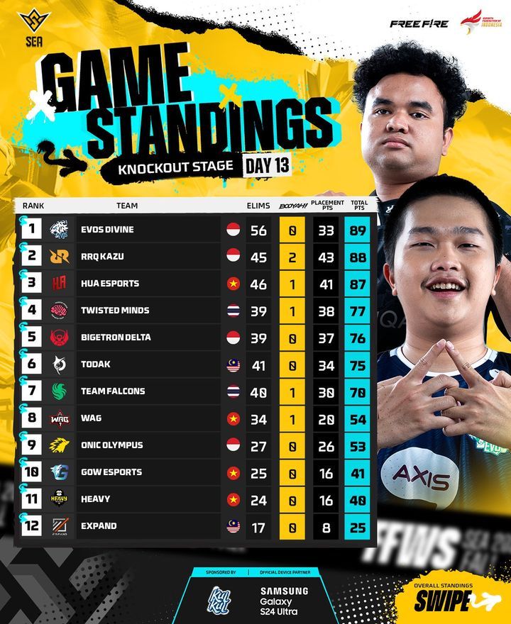 Walau tidak merebut Booyah!, tim EVOS Divine justru bertengger di puncak klasemen harian dengan 89 poin, disusul oleh RRQ Kazu yang menyusul tipis di posisi dua dengan 88 poin. Walau EVOS Divine dan RRQ Kazu masing-masing bisa mengemas poin dari jumlah kill dan placement point tinggi, kedua tim unggulan Indonesia ini masih belum mampu mengemas poin lebih banyak karena performa untuk survive di posisi teratas yang masih belum terlalu konsisten.