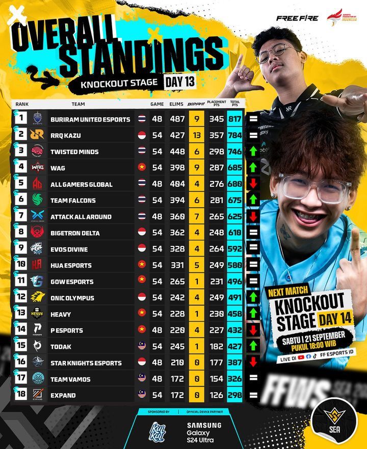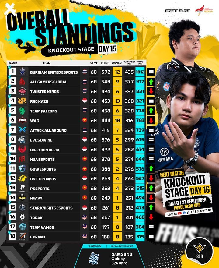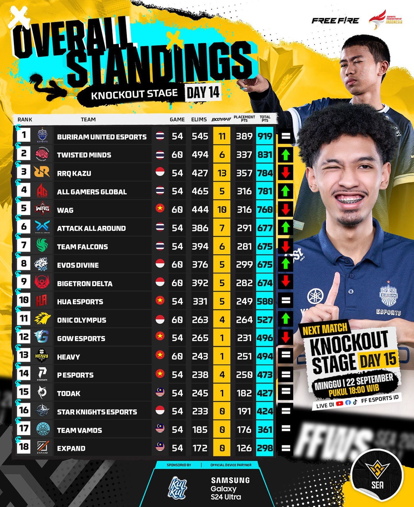 Zona top 3 klasemen sementara akhirnya dikuasai oleh 3 tim Thailand, Buriram United Esports, AG Global, dan Twisted Minds masing-masing dengan raihan 1012, 917, dan 831 poin. Posisi klasemen RRQ Kazu yang underperform di matchday 15 harus rela tergusur di peringkat 4 dengan 821 poin.