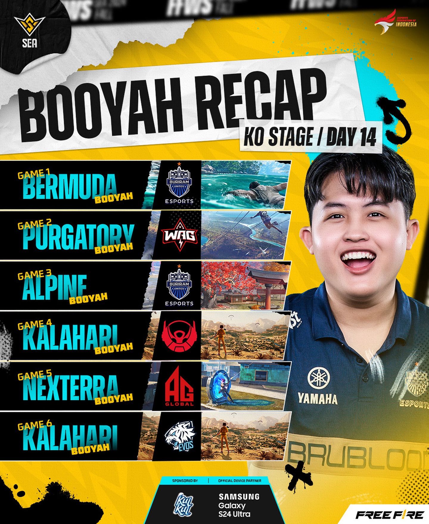 Tampilnya Buriram United Esports di matchday ini kembali menyajikan pemandangan familiar di fase knockout FFWS SEA 2024 Fall, di mana mereka lagi-lagi kembali mendominasi klasemen harian dengan mengemas dua Booyah! dan 102 poin. Di belakangnya ada All Gamers (AG) Global yang menguntit tipis dengan 101 poin dan 1 Booyah!, serta Twisted Minds di posisi ketiga.