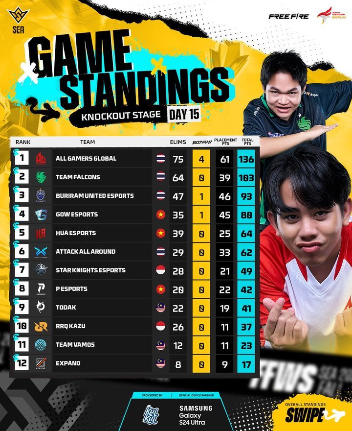 Tampil all-in dengan empat tim, tim-tim Thailand lagi-lagi mendominasi klasemen harian Matchday 15 FFWS SEA 2024 Fall. AG Global tak tanggung-tanggung langsung merebut 4 Booyah! di 4 ronde awal matchday ini dan bertengger di puncak klasemen harian dengan 136 poin. Team Falcons, dan Buriram United Esports menyusul di belakangnya, masing-masing dengan 103 dan 93 poin (serta 1 Booyah!). Team Attack All Around (AAA) tertinggal di belakang di posisi 6 dengan mengumpulkan 62 poin. Tren menguatnya perwakilan Vietnam di musim ini kembali ditunjukkan oleh tim GOW dan Hua Esports yang bertengger di posisi 4 dan 5 klasemen harian.