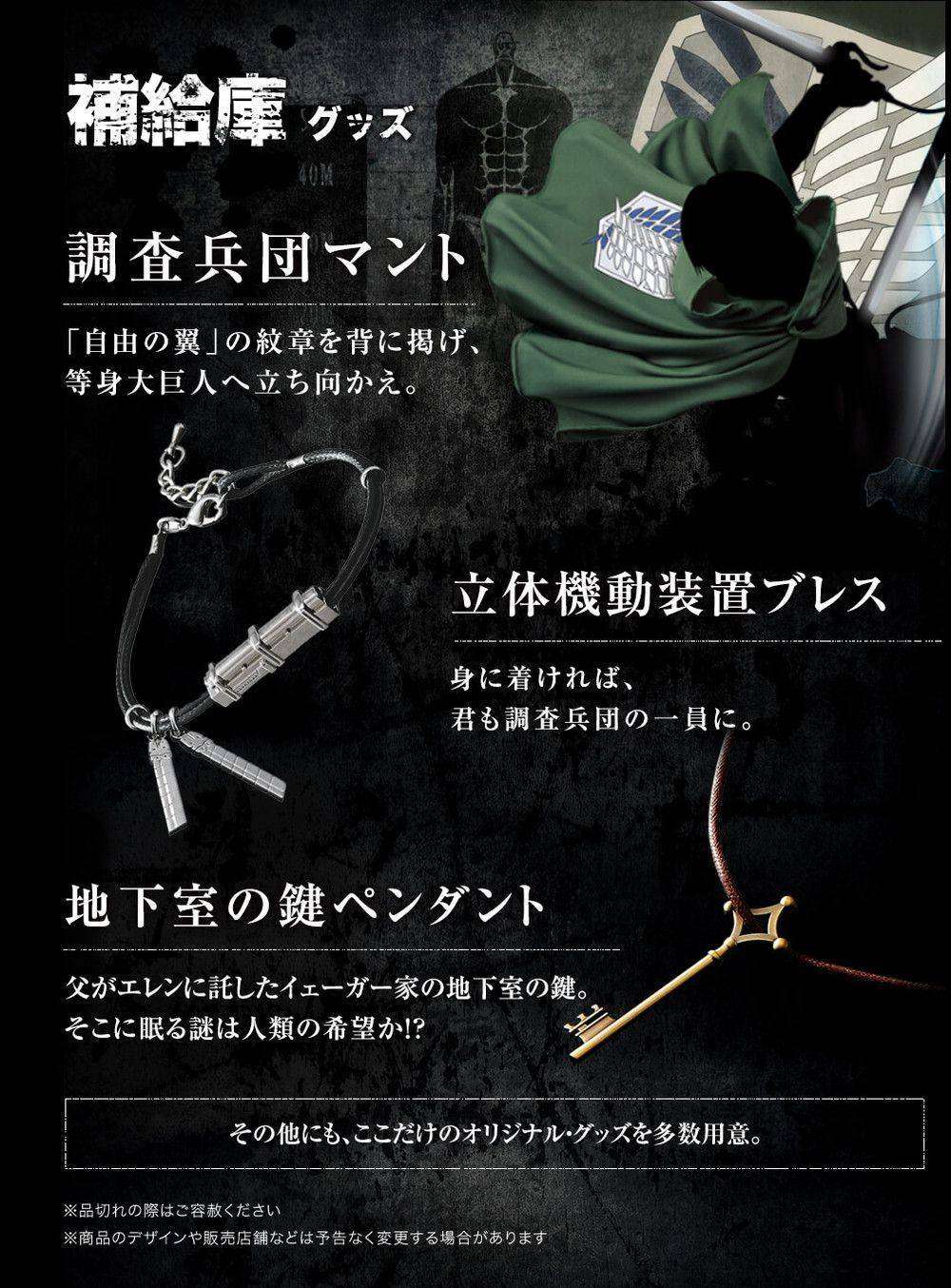 Selain itu Universal Studio juga menyediakan ransum makanan ala para personel Survey Corps seperti bacon, kentang, roti rasa teh hitam, dan sup (untuk komandan), maupun kentang, roti, dan sup (untuk prajurit biasa). Univeersal Studio juga menjual perlengkapan para Survey Corps seperti mantel, gelang berbentuk 3D Maneuver Gear, maupun kunci.