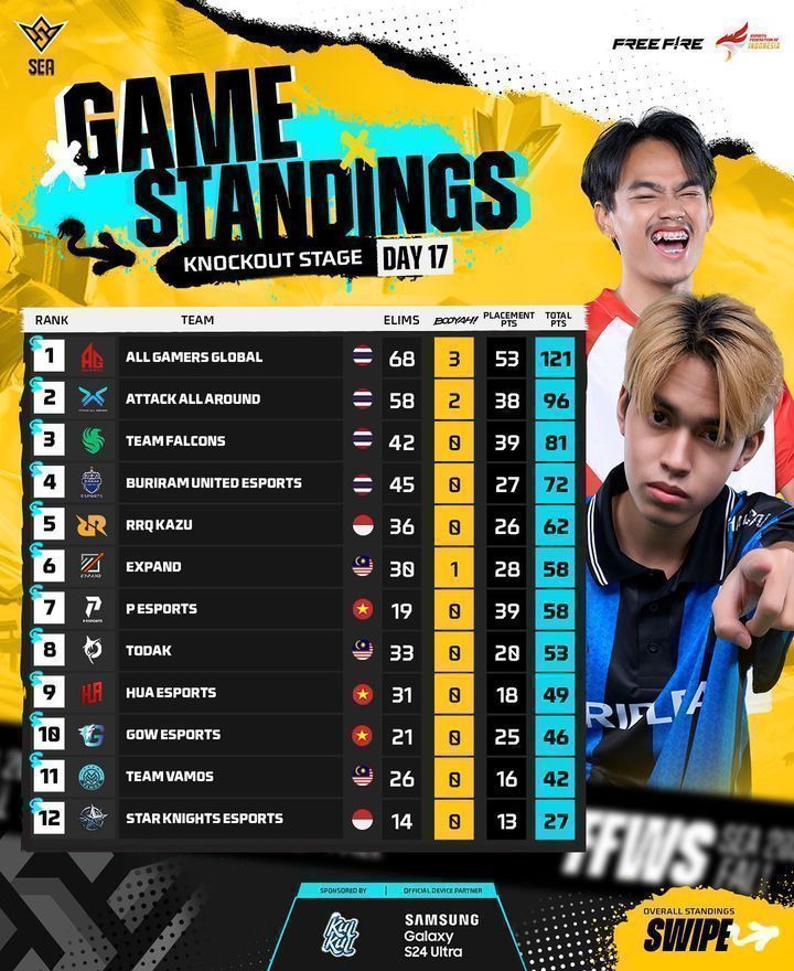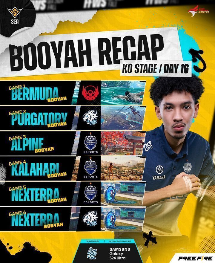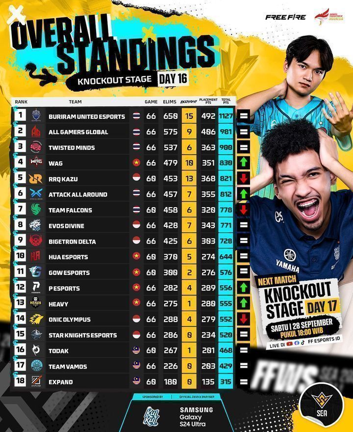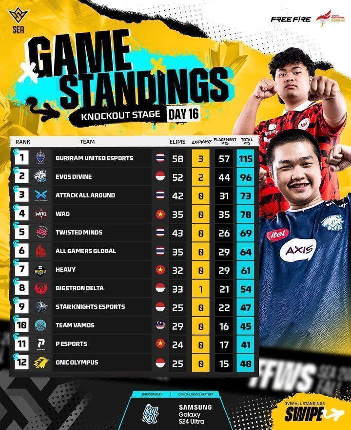 Fase knock-out turnamen Free Fire World Series (FFWS) SEA 2024 Fall akhirnya berakhir juga di Week 6 pada 27-29 September 2024. Ke-16 tim esports Free Fire terbaik se-Asia Tenggara telah menunjukkan aksi adu strategi dan jump shoot terbaik-nya untuk bisa berada di zona Top 12 dan bertanding di babak Grand Final pada 11-13 Oktober mendatang di Surabaya!