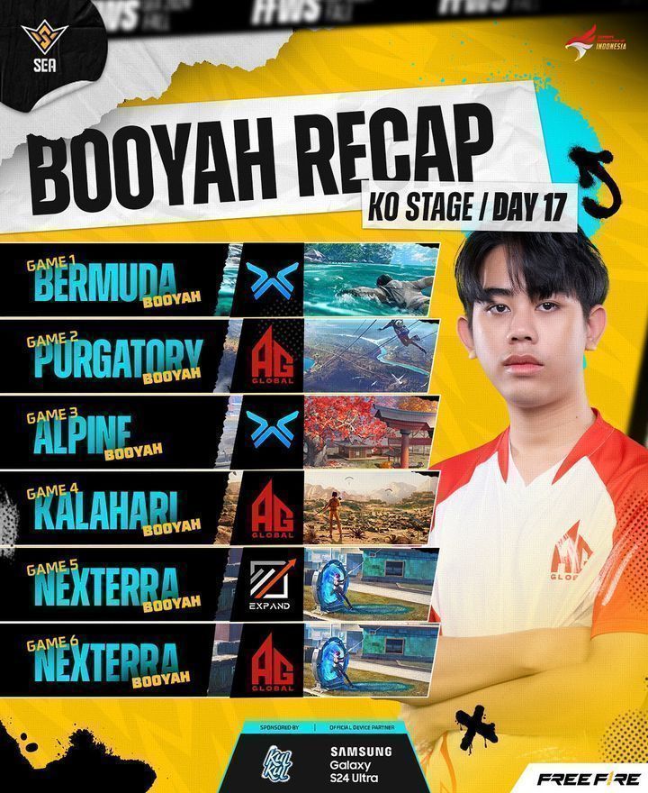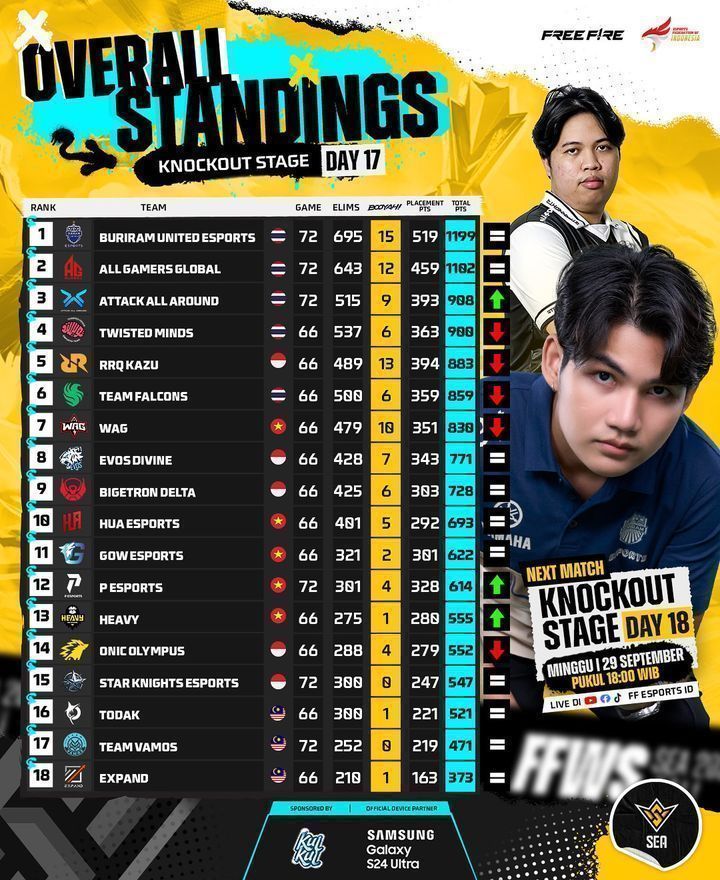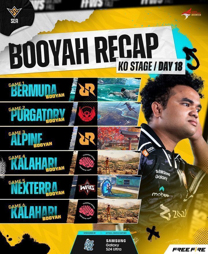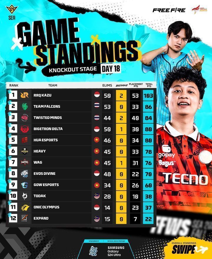 Setelah melewati 6 pekan fase Knockout, akhirnya 3 tim Indonesia dipastikan akan bermain di babak Grand Final FFWS SEA 2024 Fall, yaitu RRQ Kazu, EVOS Divine. dan Bigetron Delta. RRQ Kazu pun menjadi tim Indonesia terbaik dengan finish di posisi 3 klasemen overall, di bawah Buriram United Esports dan AG Global, serta mengumpulkan 15 Booyah! bersama dengan tim Buriram United. Yang menarik, pada musim ini tidak ada tim Free Fire Malaysia yang lolos ke Grand Final.
