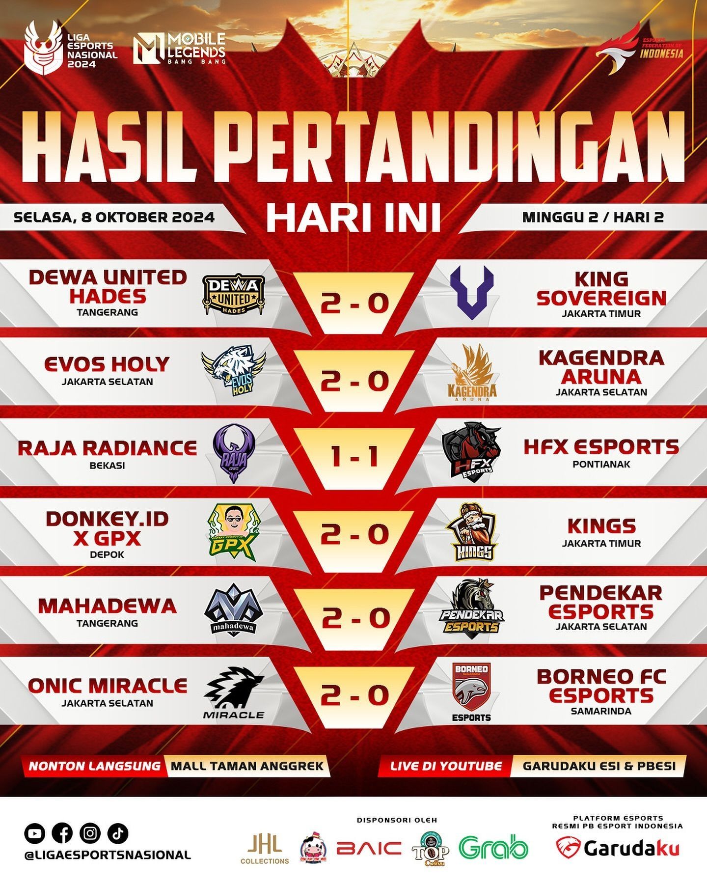 Match pembuka di day 2 week 2 dimulai dengan kemenangan mutlak dari Dewa United Hades yang berhasil meluluhlantakkan Kings Sovereign dengan skor 2-0 lewat penggunaan Hero serta gameplay yang terbaik dari Dyxon dan Lannaya di dua round berjalan. Sedangkan di stage sebelah yang mempertemukan antara Donkey ID GPX dengan Kings yang baru saja dijatuhi sanksi berakhir dengan kemenangan yang sangat manis bagi Donkey ID GPX dengan hasil 2-0.