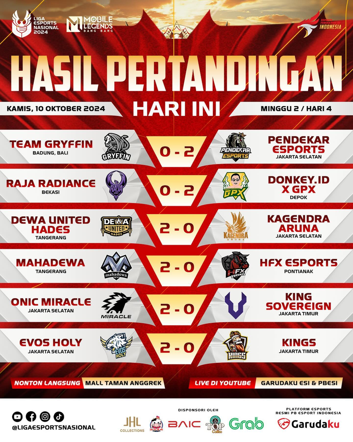 Pada akhirnya, dengan hasil matchday di week 2 day 4 kali ini masih dikuasai oleh Dewa United Hades yang masih berada di posisi puncak klasemen lewat kemenangan sempurna di hari ini. walau tim tersebut menerima hasil imbang pada matchday kemarin. Sementara untuk EVOS Holy yang baru bermain di hari ini harus puas di posisi kedua dengan hasil tidak ada point imbang maupun kalah sama sekali selama fase liga berlangsung. Persaingan kejar-kejaran point terjadi pada Mahadewa yang mempunyai 1 point lebih dari lawannya, ONIC Miracle yang sama-sama meraih kemenangan di hari ini.