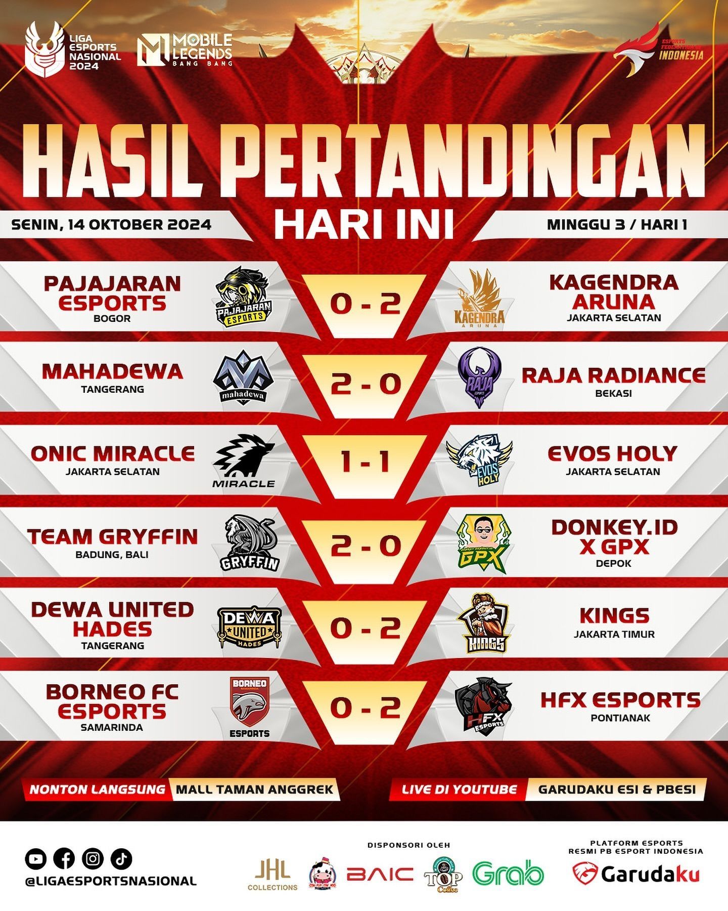 Pada match pembuka dimulai dengan pertemuan antara Kagendra Aruna dengan Pajajaran Esports yang berakhir dengan kemenangan dari Kagendra Aruna dengan skor telak 2-0 pada hari ini. Kemenangan dua kali berturut-turut dari Kagendra Aruna menjadi sebuah pembangkit di sisa-sisa match yang ada untuk berada di posisi paling aman dari degradasi. Sementara itu, Team Gryffin berhasil menjinakkan sang peraih posisi ke-5, Donkey ID GPX lewat penampilan apik dari Tompu dan Haipoo yang mampu dengan mudahnya melumatkan seluruh squad Donkey ID GPX hingga berakhir dengan skor 2-0.