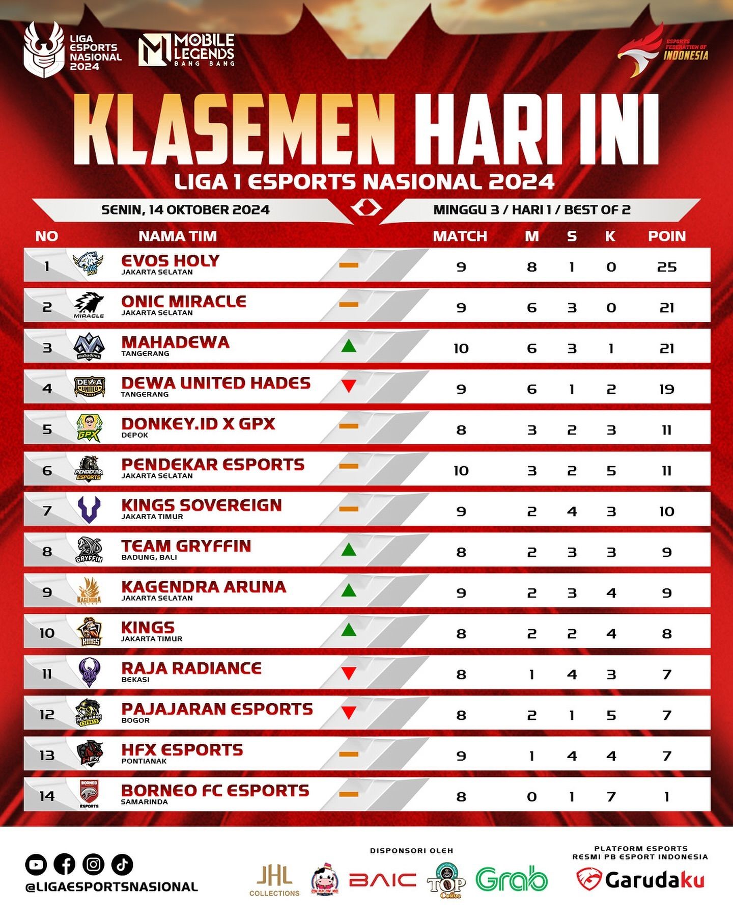 Dengan demikian, week 3 di day 1 pertama EVOS Holy masih tetap kokoh di puncak klasemen sementara di hari ini, walau persentase winrate di fase liga yang sebelumnya 100% harus pecah di tangan ONIC Miracle. Mahadewa berhasil menggeser posisi sang kakak, Dewa United Hades, dan kini mereka berada di posisi ketiga pada hari ini. Persaingan di papan tengah mulai memanas karena ketiga tim seperti Kings, Kagendra Aruna dan Team Gryffin harus bersaing untuk bisa mendapatkan slot playoff atau bertahan untuk tidak berada di posisi tiga terbawah.