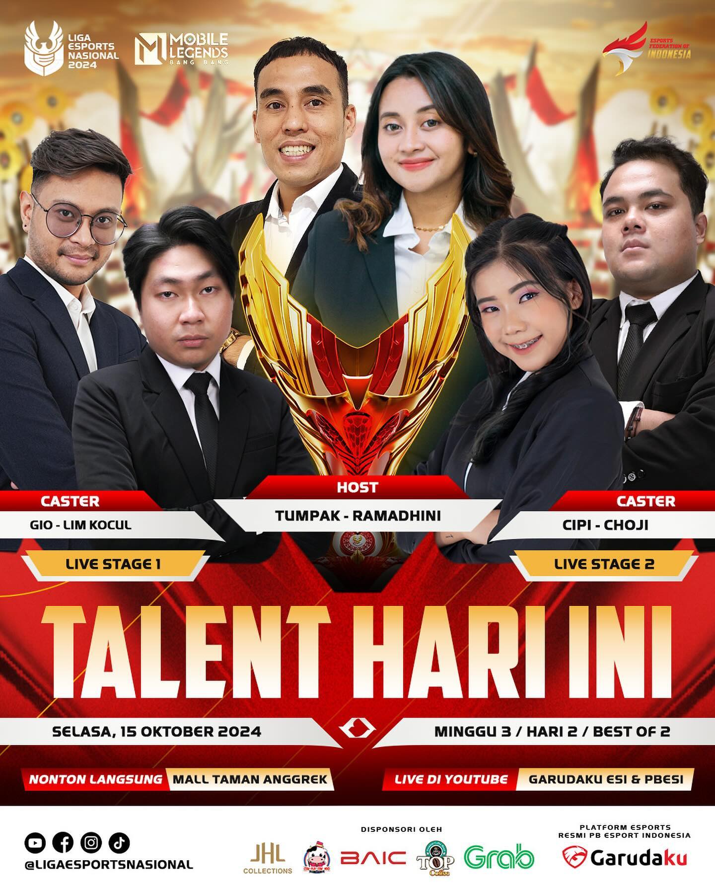 Untuk menemani pertandingan-pertandingan seru di turnamen Esports Liga 1 Esports Nasional 2024 (LEN 2024), terdapat caster-caster ternama akan memandu jalannya pertandingan hari ini, di Stage 1 ada Gio dan Lim Kocul, sementara di Stage 2 ada Cipi dan Choji. Acara ini juga akan dipandu oleh host Tumpak dan Ramadhini yang siap menyajikan berbagai momen menarik sepanjang pertandingan.