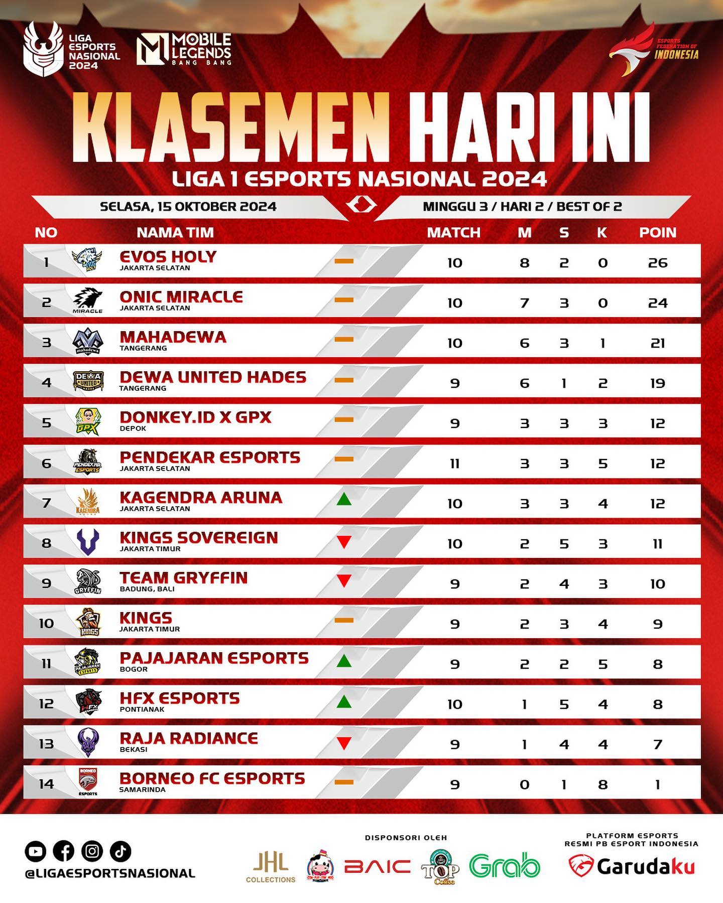 Dengan hasil pertandingan di hari ini, EVOS Holy masih tetap berada di posisi puncak klasemen sementara dengan membawa dua kali seri pada dua hari ini. Sementara ONIC Miracle butuh dua point lagi untuk bisa menggeser posisi EVOS Holy. Borneo FC Esports semakin tidak ada harapan di Liga 1 Esports Nasional 2024 ini setelah timnya mendapatkan 8 kali kekalahan dan 1 kali seri selama fase liga berlangsung. Sementara itu, perebutan di posisi papan tengah semakin memanas karena Kagendra Aruna, Kings Sovereign dan Team Gryffin bisa saja menjadi ancaman bagi Pendekar Esports dan Donkey ID GPX untuk mendapatkan tiket playoff di musim ini.