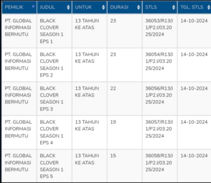 Anime Black Clover dilaporkan akan segera tayang di stasiun televisi GTV. Hal ini terungkap setelah adanya informasi dari Lembaga Sensor Film mengenai lulus sensornya anime ini, atas nama PT. Global Informasi Bermutu alias GTV. Masih belum ada informasi lebih lanjut kapan kiranya anime ini akan mulai ditayangkan oleh GTV.