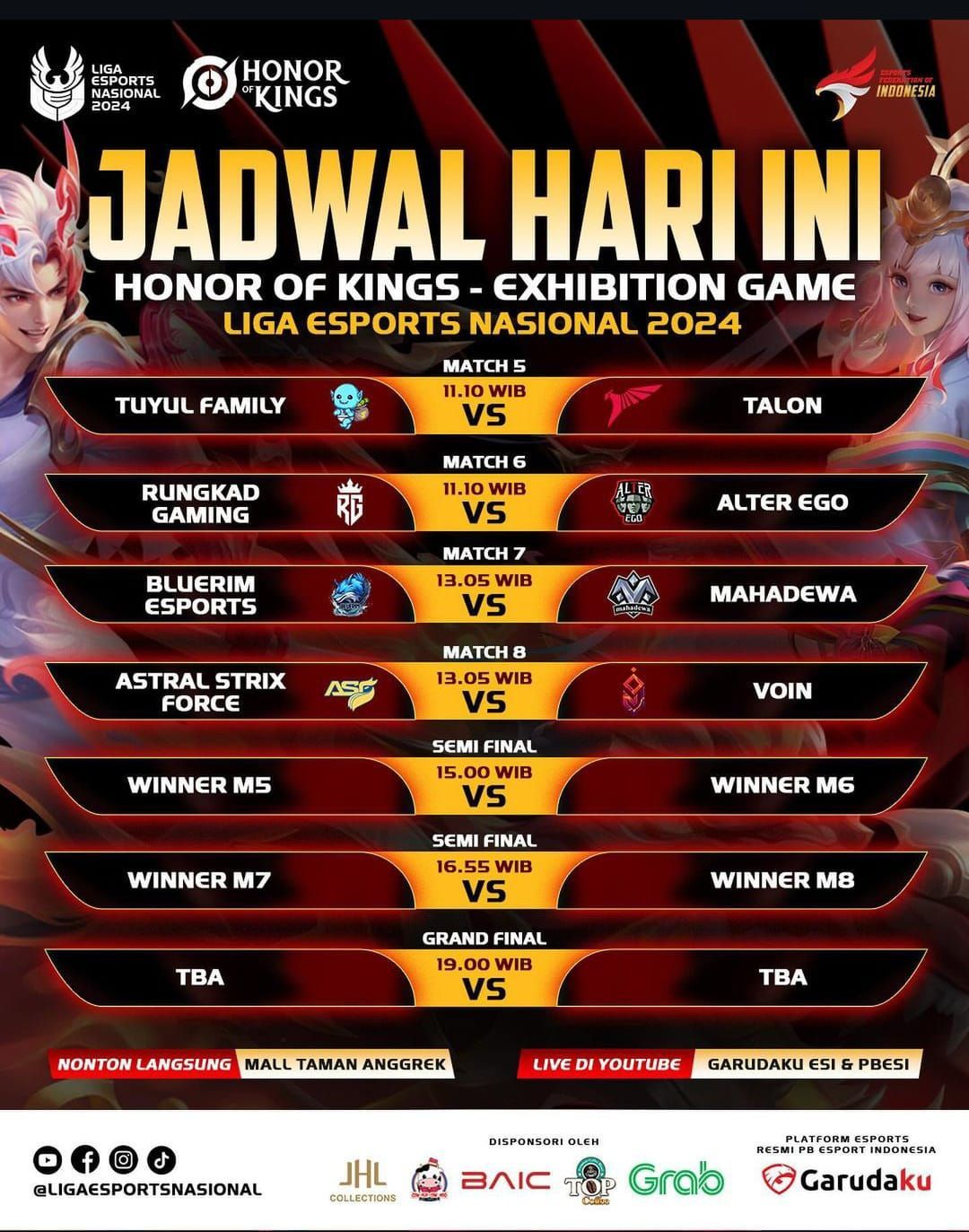 Ada 8 tim yang terdiri dari 4 tim rookie dan 4 tim profesional yang akan berhadapan satu sama lain di panggung Liga Esports Nasional 2024 untuk mendapatkan prizepool sebesar Rp 150.000.000,-. 4 tim rookie di match ini adalah Tuyul Family, Rungkad Gaming, Bluerim Esports dan Astral Strix Force. Sedangkan untuk 4 tim pro yang menemani panggung exhibition games Honor Of Kings adalah Talon, Alter Ego, Mahadewa dan Voin.