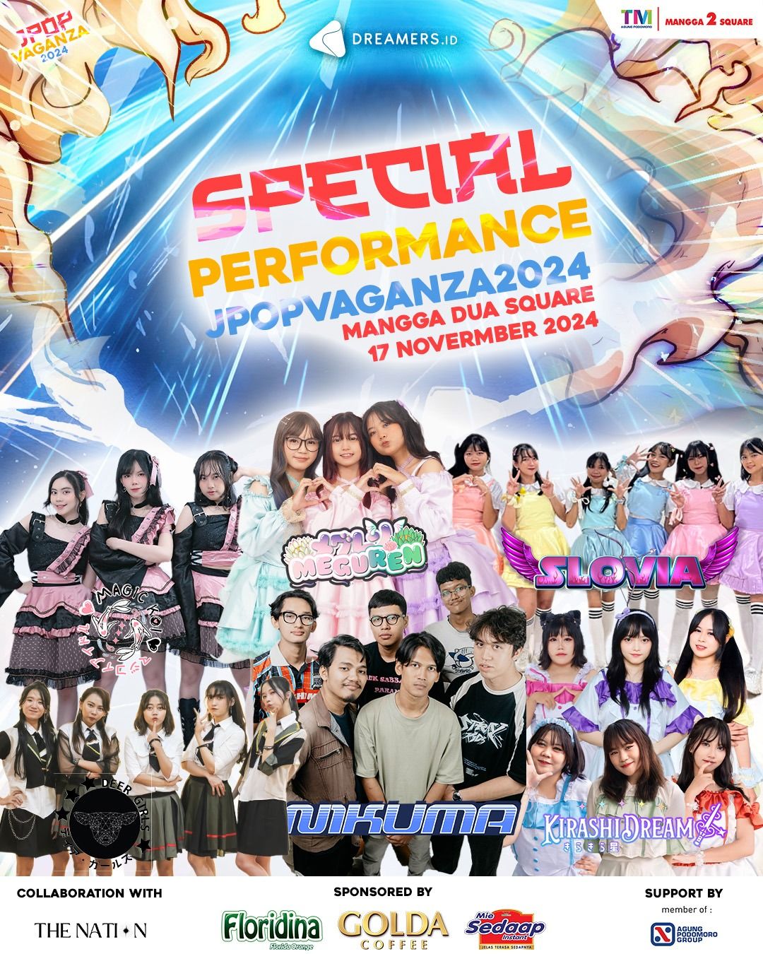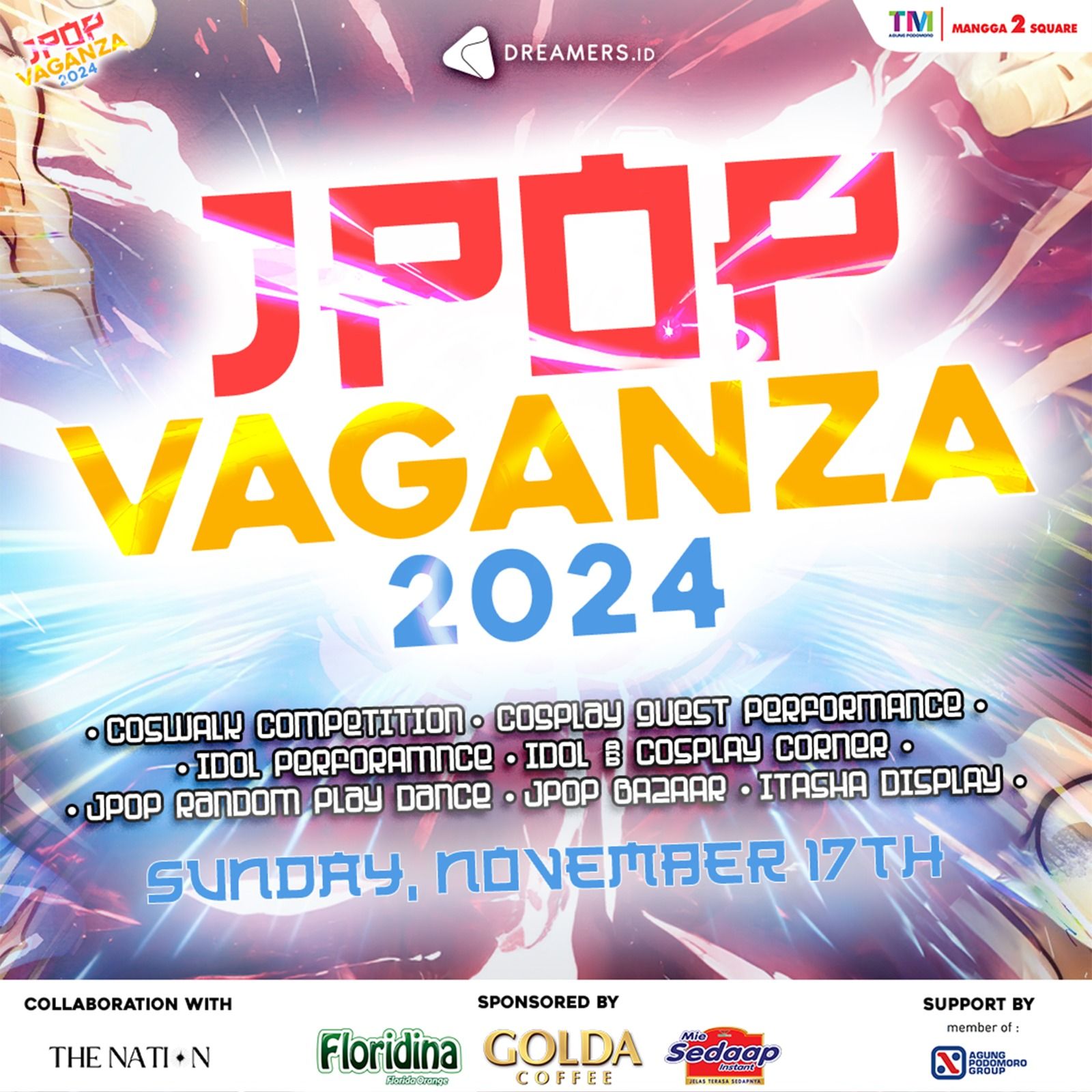 DREAMERS JPOP VAGANZA 2024 berkolaborasi dengan The Nation akan diselenggarakan pada hari Minggu, 17 November di Mangga Dua Square. Acara ini disponsori oleh Floridina, Golda Coffee, dan Mie Sedaap!
