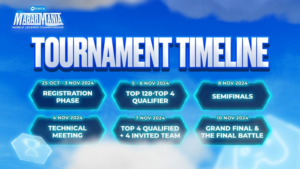 Pendaftaran DANA MABARMANIA akan dibuka tanggal 29 Oktober sampai dengan 3 November 2024. Siaran langsung turnamen ini akan dilaksanakan pada tanggal 7, 8, dan 10 November 2024.