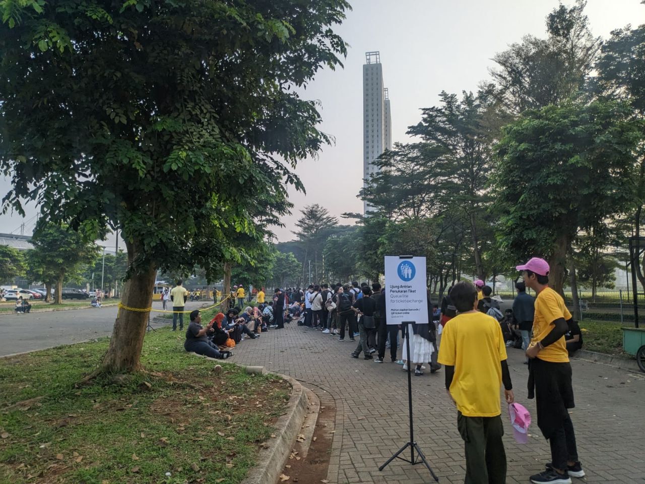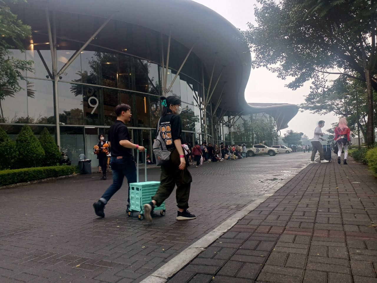 Walau loket penukaran tiket baru dibuka pada jam 08.30 WIB, ternyata masih ada pengunjung yang sudah mengantre sejak jam 5 pagi. Datang menggunakan kendaraan pribadi dan transportasi umum, para pengunjung perlahan memenuhi area parkir seberang ICE Hall 10.