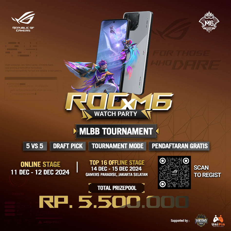 ASUS Indonesia dengan bangga mengundang para penggemar game ke acara ROG x M6 Watch Party yang akan berlangsung pada tanggal 14 & 15 Desember 2024. Acara menarik ini menandai perayaan ROG Phone 8 sebagai Global Official Gaming device untuk Mobile Legends: Bang Bang M6 World Championship 2024. Para peserta akan memiliki kesempatan untuk mendapatkan pengalaman serunya berkompetisi esports dengan berpartisipasi dalam turnamen offline eksklusif Mobile Legends: Bang Bang untuk memperebutkan total hadiah sebesar Rp 5.500.000! Pengunjung juga bisa mendapatkan kesempatan untuk memenangkan doorprize yang fantastis, termasuk ROG G-Shock edisi terbatas. Selain itu, agar seluruh pengunjung dapat lebih menikmati acara ini, ASUS juga menyediakan minuman gratis untuk seluruh pengunjung selama acara berlangsung.