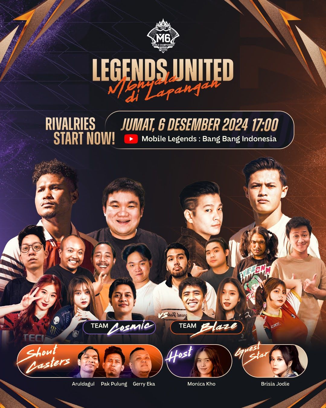 Pertandingan sengit antara Team Blaze, yang dipimpin oleh Alfeandra Dewangga dan Jonathan Liandi, melawan Team Cosmic, yang dipimpin oleh Bagus Kahfi dan Donkey, hadir khusus untuk penggemar setia MLBB di Indonesia. MLBB bertujuan untuk menunjukkan kesamaan antara sepak bola dan esport selama periode M6 World Championship, di mana Tim Indonesia RRQ & TLID berhasil melaju ke Knockout Stage dengan semangat juang yang ‘menyala’ untuk mengharumkan nama Indonesia.