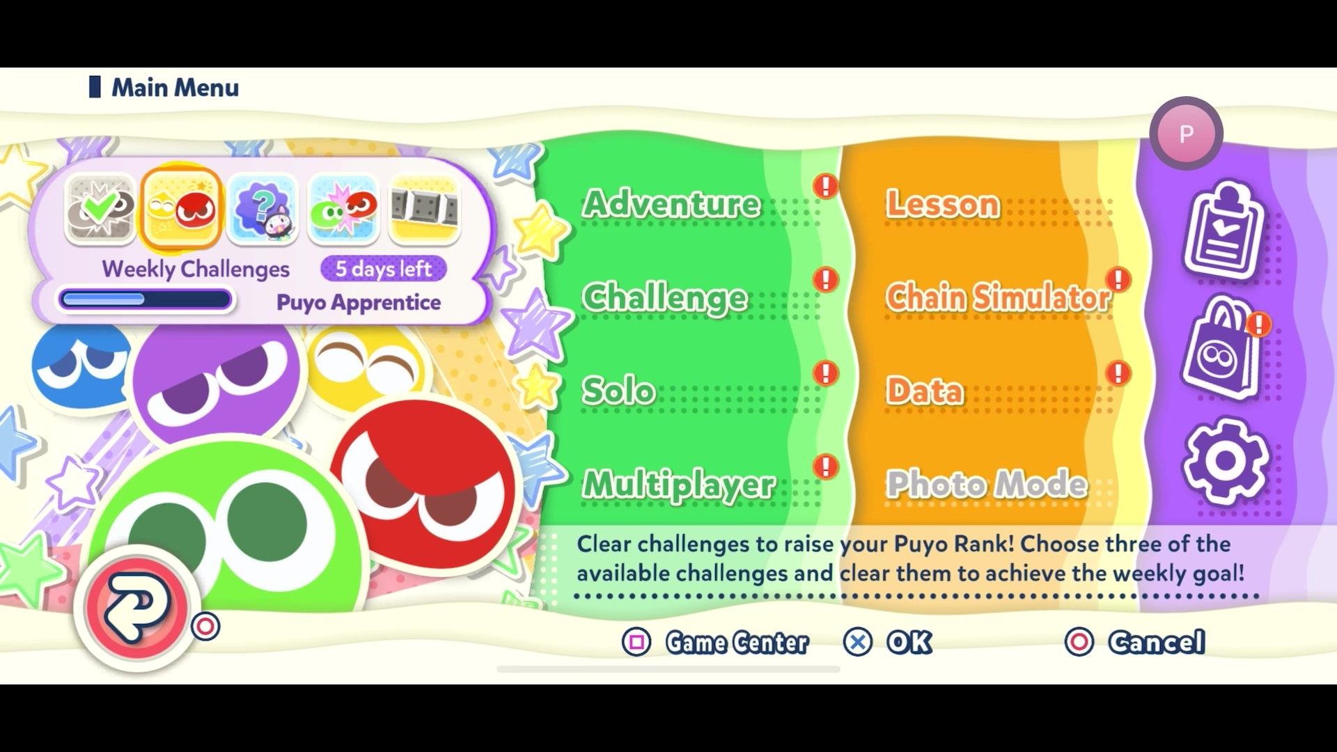 Dalam fitur Weekly Challenge, pemain dapat memilih tiga tantangan dari lima yang tersedia setiap minggunya. Setiap tantangan yang berhasil diselesaikan akan mengisi bar gauge pemain, dan setelah penuh, peringkat Puyo mereka akan meningkat. Tantangan ini diperbarui setiap minggu, sehingga pemain didorong untuk menyelesaikan semua tantangan dan mencapai peringkat tertinggi, Puyo Puyo Master.