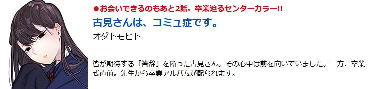 Komik Komi-san atau Komi Sulit Berkomunikasi sebagaimana telah diberitakan sebelumnya, telah memasuki lakon terakhirnya. Kini terungkaplah bahwa komik ini akan segera berakhir dalam 2 chapter lagi.