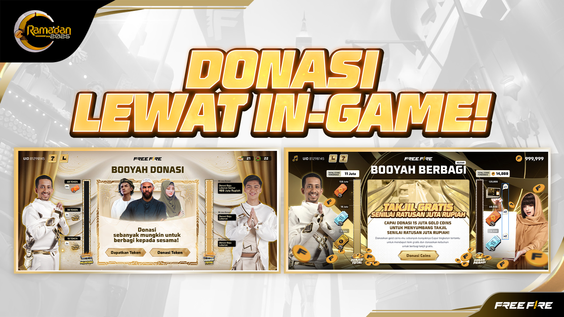 - Booyah Berbagi Iftar: Event donasi ini akan hadir pada tanggal 3-9 Maret 2025. Pemain dapat turut berdonasi dengan menyumbangkan Gold Coin di dalam game yang didapatkan secara gratis. Semakin cepat donasi Gold Coin mencapai target 15 juta Coin, semakin cepat donasi paket iftar yang akan dibagikan di berbagai daerah di Indonesia.