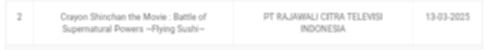Stasiun televisi RCTI tengah berencana untuk menayangkan film layar lebar 3D New Dimension! Crayon Shin-chan the Movie Battle of Supernatural Powers ~Flying Sushi~ atau PERTARUNGAN PSIKOKINESIS: SUSHI TERBANG. Hal ini terungkap melalui data di Lembaga Sensor Film, di mana RCTI telah mendaftarkan film ini, dan film ini tercatat telah lulus sensor pada tanggal 13 Maret 2025. Masih belum ada informasi lebih lanjut mengenai tanggal rilisnya. Namun ini akan menjadi pertamakalinya anime Shinchan tayang di RCTI selama hampir 10 tahun terakhir.