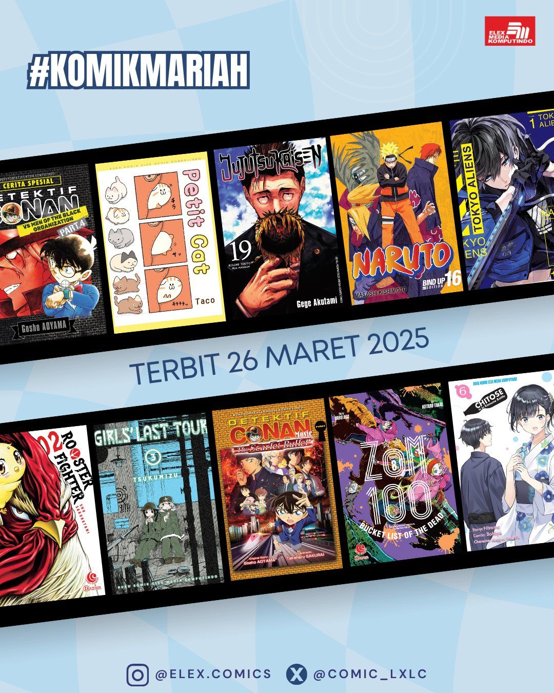 Melalui akun media sosialnya, penerbit Elex Media Komputindo memberikan bocoran mengenai sejumlah komik yang rencananya akan diterbitkan pada minggu keempat atau terakhir bulan Maret 2025. Beberapa judul ada yang merupakan seri atau volume baru ataupun seri yang diterbitkan ulang. Jika tidak ada halangan, maka komik-komik ini akan terbit pada tanggal 26 Maret 2025. Inilah bocoran komik Maret 2025 (minggu keempat/terakhir):