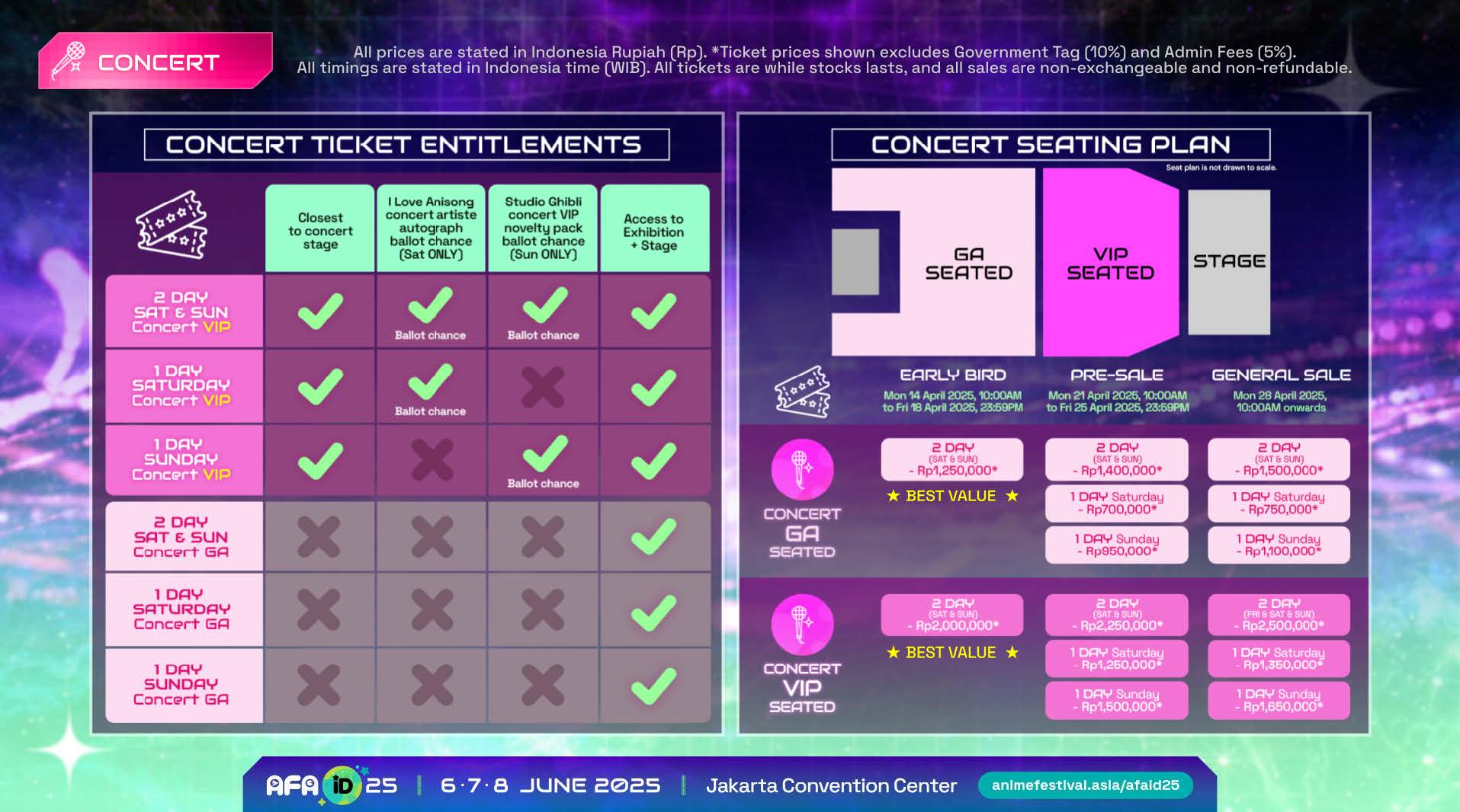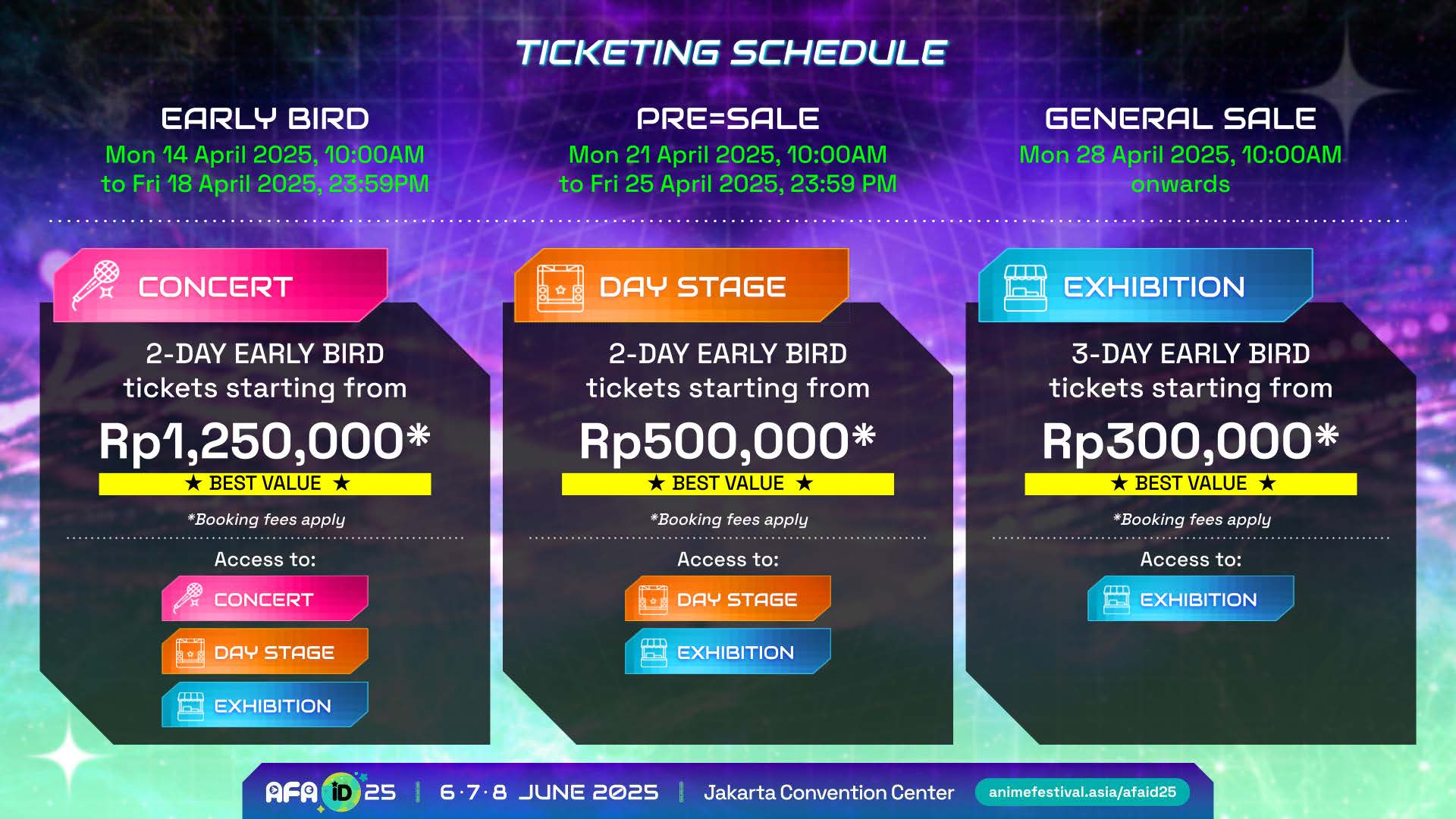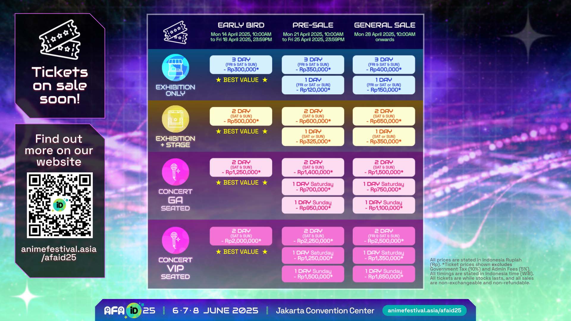 #Kaoreaders sudah tidak sabar untuk jalan-jalan ke AFAID 2025? Inilah detil harga tiketnya! Tiket Early Bird dan paket VIP mulai dijual 14 April 2025 pukul 12.00 WIB melalui website https://animefestival.asia/