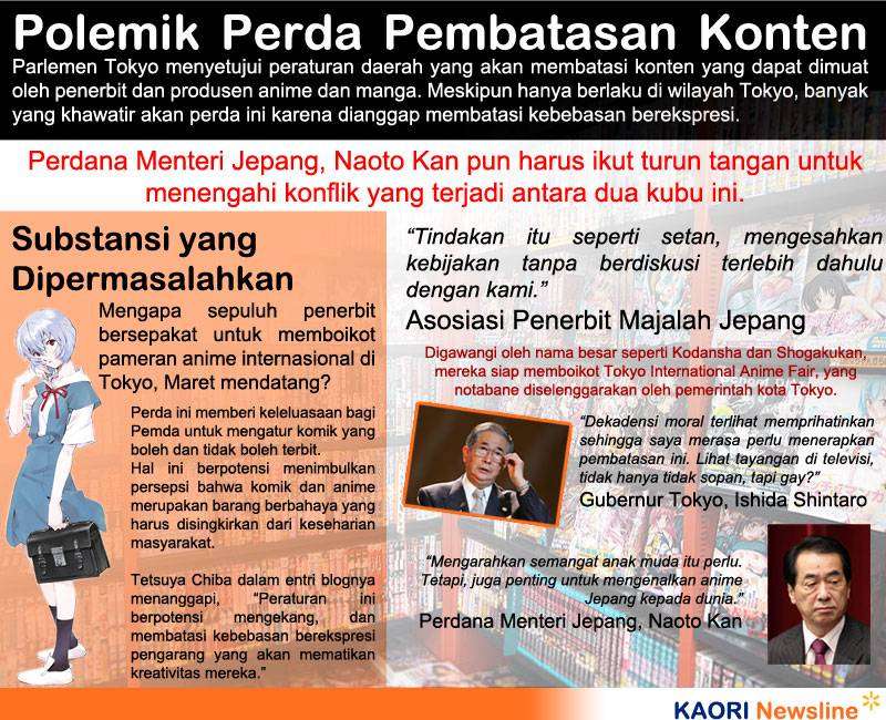 Hari Rabu lalu (15/12), DPRD Tokyo mengesahkan perda yang akan membatasi konten yang dianggap berbahaya, seperti pemerkosaan, kejahatan seksual, inses, dan "gambar lain yang tidak patut secara moral". Setelah perda ini disahkan, pemda Tokyo berhak melarang komik, bagaimana dan di mana mereka dapat dijual.