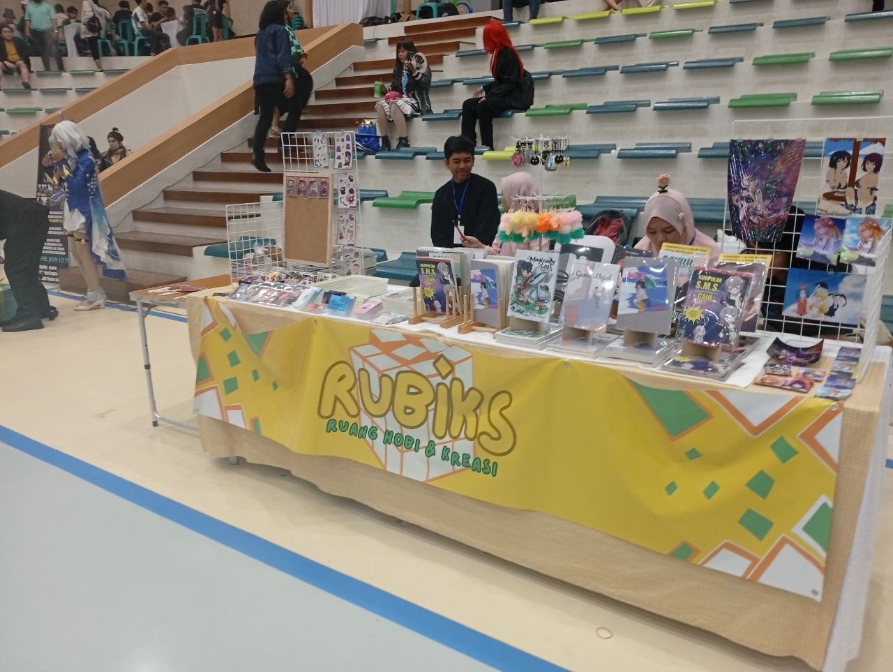 Tidak jauh dari booth Saturdraw di C3 dan C4, kami juga melangkah dekat mengunjungi booth RUBIKS (Ruang Hobi dan Kreasi) yang terletak di C1 dan C2. Kalau tadi kita ketemu dengan illustrator sekarang di booth Rubiks ini kita bertemu dengan penulis atau author dari light novel. Banyak sekali barang-barang literasi yang bisa dapat kita temukan di sini, dari light novel dan novel seperti beberapa judul seperti KIMONOGATARI, Garis Wajah, dan Sayonara Midnight, komik original Magically Lost, berbagai doujinshi Satoru Gojo x Yuuji Itadori, dan juga Unofficial Fanbook Honkai Stairail dengan gaya komedi ala buku kumpulan-kumpulan kata SMS Gaul jadul.