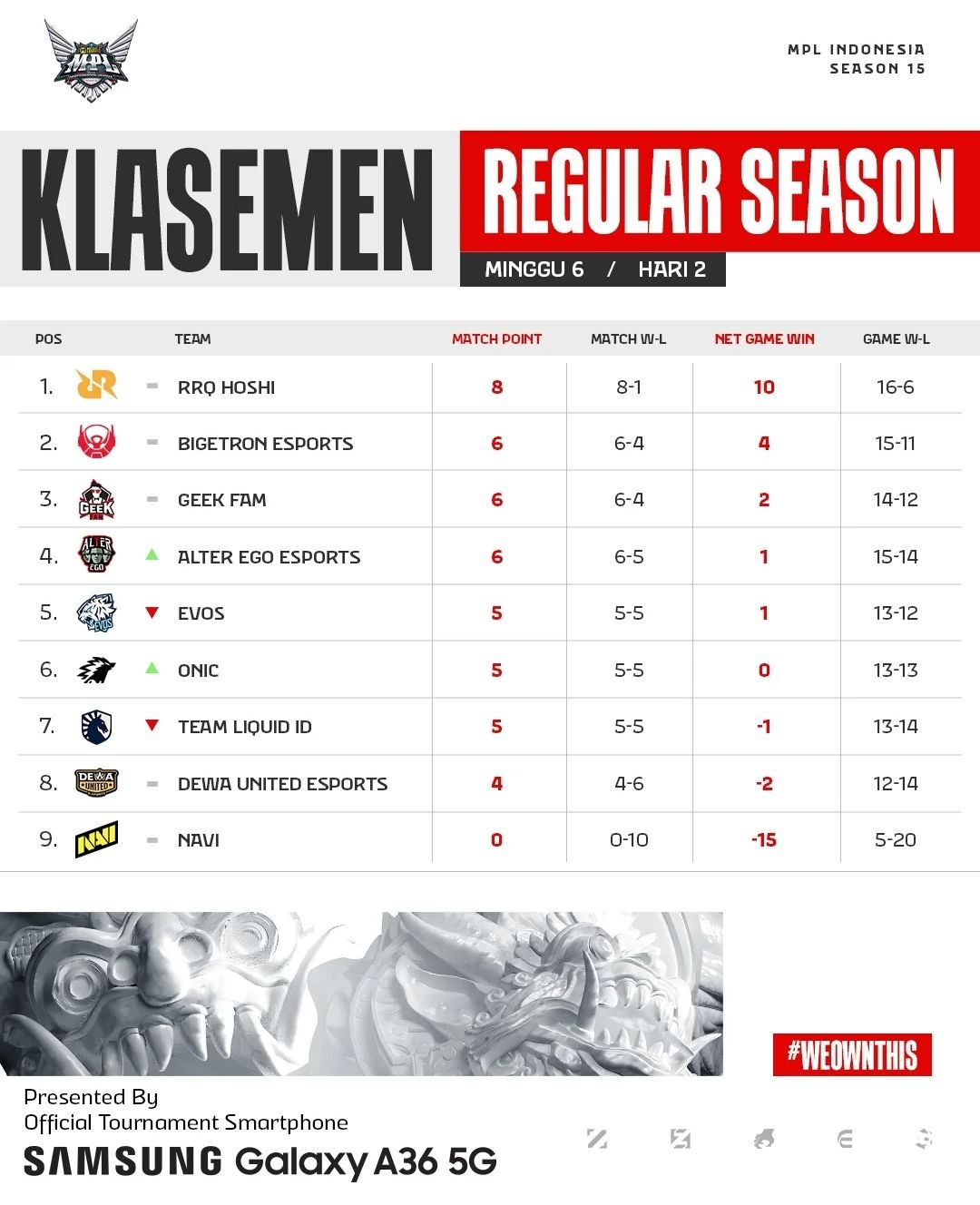 Ada dua tim yang berhasil memperbaiki posisi di hari kedua pada week keenam MPL ID Season 15, yaitu Alter Ego naik ke posisi keempat dan ONIC pun naik ke posisi keenam. Kekalahan EVOS di hari ini membawa timnya ke posisi kelima, sementara untuk Team Liquid ID juga turun ke posisi tujuh di klasemen sementara.