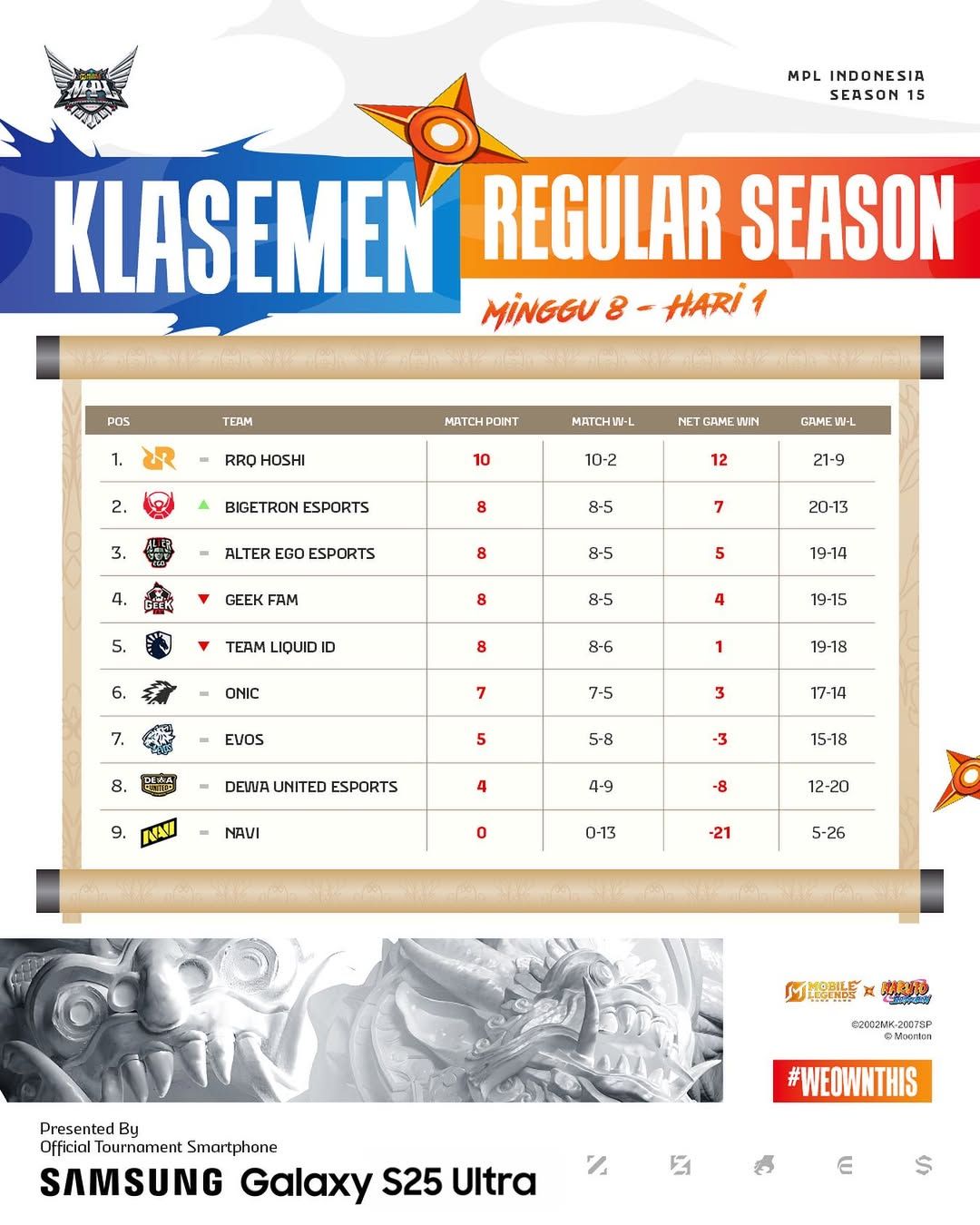 Selepas matchday Week 8 Day 1, Alter Ego masih bertengger di posisi ketiga klasemen MPL ID Season 15 dengan modal 8 match point. Sementara itu, Bigetron Esports naik ke posisi kedua klasemen sementara setelah menaklukkan Dewa United Esports.
