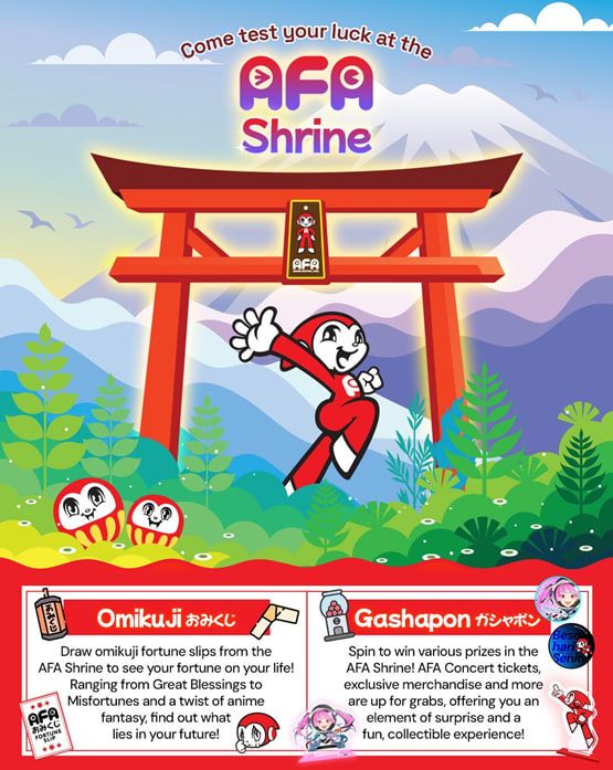 Temukan keberuntungan Anda di AFA Shrine! Rasakan pengalaman unik meramal nasib dengan gaya Jepang di booth Omikuji kami! Kamu juga bisa mencoba keberuntunganmu di booth Gashapon dan berkesempatan memenangkan berbagai hadiah menarik seperti tiket konser AFA Night, merchandise edisi terbatas, dan berbagai koleksi seru lainnya!