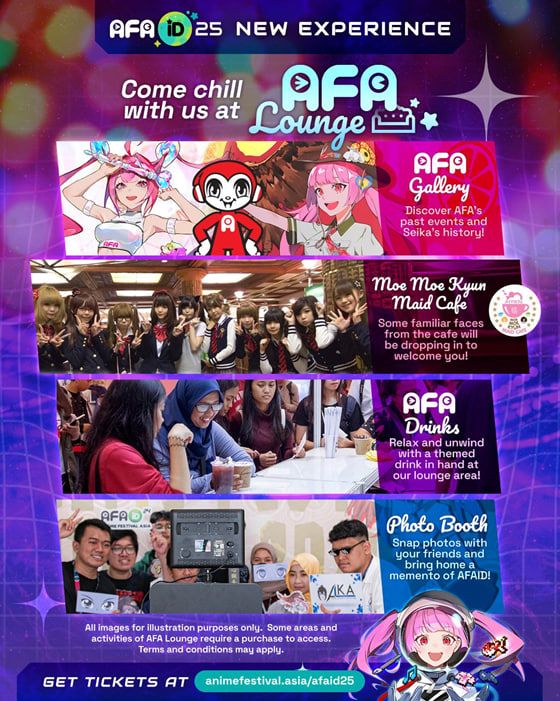 Bernostalgia kembali di AFA Lounge terbaru kami! Temukan kembali berbagai momen spesial dari acara AFA sebelumnya, nikmati persembahan khusus kami untuk mengenang maid cafe orisinal AFA, Moe Moe Kyun, lihat berbagai wujud Seika-chan, ambil foto kenangan bersama teman-teman, dan masih banyak lagi!