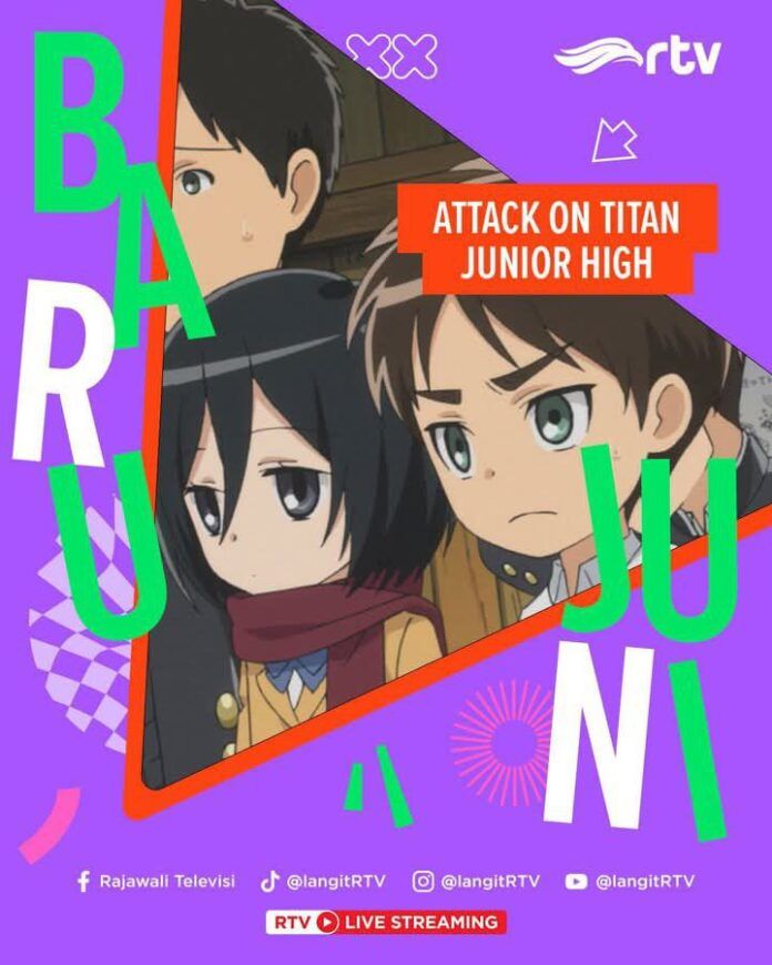 Stasiun televisi RTV atau Rajawali Televisi sebagaimana telah diberitakansebelumnya, tengah berencana untuk menayangkan animeAttack on Titan: Junior High. Anime ini sendiri sebelumnya telah dilaporkan lulus sensor, dan siap untuk ditayangkan. Kini RTV akhirnya memastikan bahwa anime ini akan ditayangkan di bulan Juni 2025. Meskipun begitu, masih belum ada informasi lebih lanjut mengenai tanggal penayangannya.