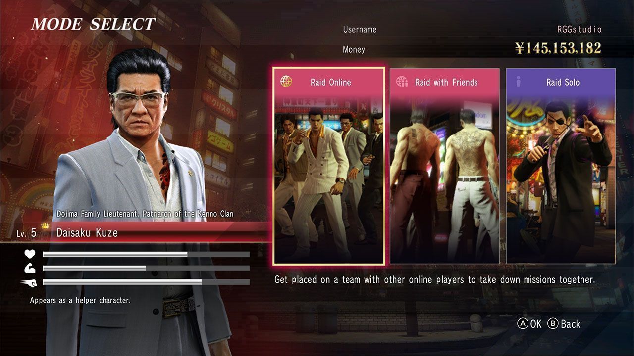 Yakuza 0 Director’s Cut menawarkan tiga cara bermain Red Light Raid: solo, bareng teman, atau online dengan pemain global. Untuk yang suka bermain santai, kalian bisa menikmati mode Raid Solo dengan bantuan karakter CPU. Sementara yang suka tantangan, bisa langsung terjun ke Raid Online atau Raid with Friends dan sinkronkan serangan untuk menghancurkan lawan.